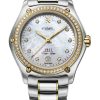 Women’s watch EBEL 1911, stainless steel and 18K yellow gold case with 60 diamonds (0.292ct), Ø 30mm, beige mother-of-pearl dial with 10 diamonds (0.052ct), date window at 6:00, sapphire crystal with antireflective treatment underneath, two-tone stainless steel links bracelet, folding clasp, Swiss quartz movement, water-resistant up to 10 bar