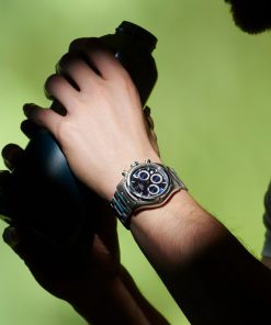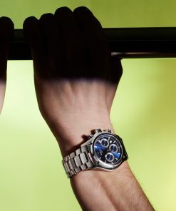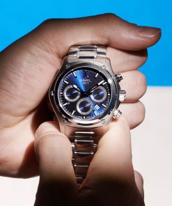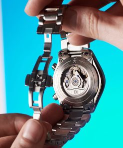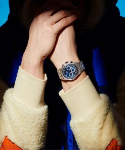 The watch features a 44mm dial in graduating midnight blue with Super-LumiNova® coated indexes and hands, and a date display at 4:30. It’s equipped with a sapphire crystal face with anti-reflective underside coating and a sapphire crystal case back. Notable for its hexagonal shape and five screws, it seamlessly integrates with a stainless steel bracelet featuring a folding clasp, ensuring comfort. The rotor showcases EBEL’s distinctive “kissing E” emblem, reflecting the brand’s legacy and ethos. An alternative black calf-skin wristband offers versatility in styling.