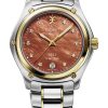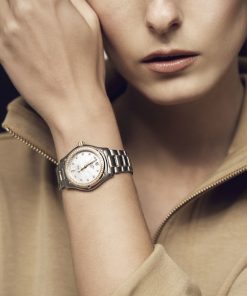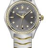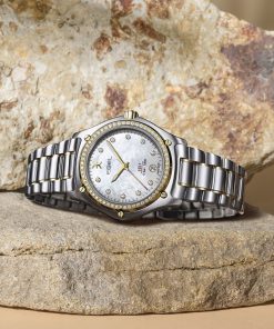 Women’s watch EBEL 1911, stainless steel and 18K yellow gold case with 60 diamonds (0.292ct), Ø 34mm, white mother-of-pearl dial with 10 diamonds (0.065ct), date window at 6:00, sapphire crystal with antireflective treatment underneath, two-tone stainless steel links bracelet, folding clasp, comes with additional fabric strap (made with upcycled ocean-bound plastic) with cork insert, Swiss quartz movement, water-resistant up to 10 bar