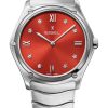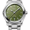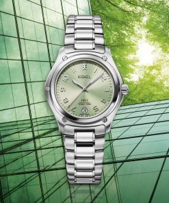 Women’s watch EBEL 1911, stainless steel case, Ø 34mm, pastel green galvanic dial with Arabic numerals, date window at 6:00, sapphire crystal with antireflective treatment underneath, stainless steel links bracelet, folding clasp, comes with additional fabric strap (made with upcycled ocean-bound plastic) with cork insert, Swiss quartz movement, water-resistant up to 10 bar