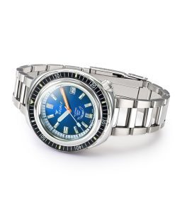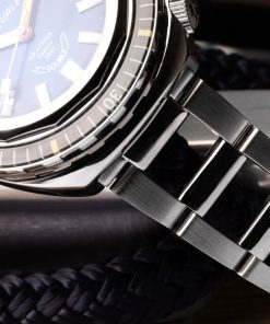 The dial pairs modern performance with vintage charm: polished indices with SuperLuminova C3, a date at 3, and the nostalgic “Saphir” label at 6. Water resistant to 600 meters and now powered by the Sellita SW200-1 Elaboré movement, the 2001. Finished with a period-correct skeleton steel bracelet, it’s a diver’s dream, then and now.