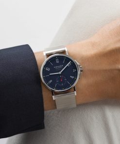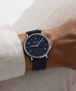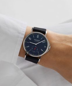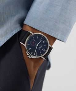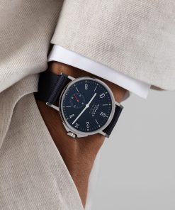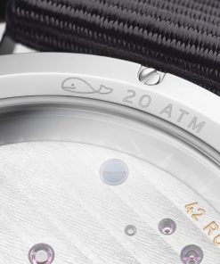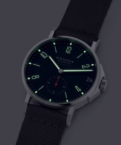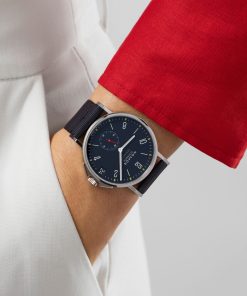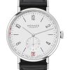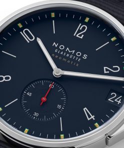 Elegance meets robustness in its stainless steel case, which includes a screw-down crown with a red warning ring and a back secured by six screws for 20 atm water resistance, marked by a whale engraving. The DUW 6101 movement features a quick-set date function, bidirectional winding rotor, 42 jewels, and the NOMOS swing system.