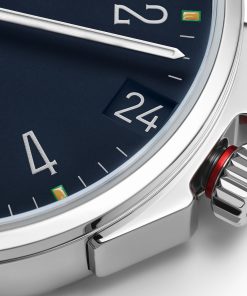 The dial features a deep oceanic blue shade, with a matching date ring and large date window at 3 o’clock. White numerals, indexes, and large hands contrast sharply with the dark blue dial for easy readability, enhanced by red and yellow accents. The luminous green hours and main hands improve visibility in low light.