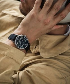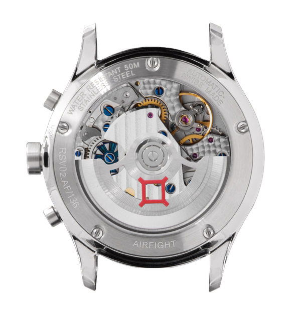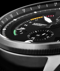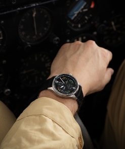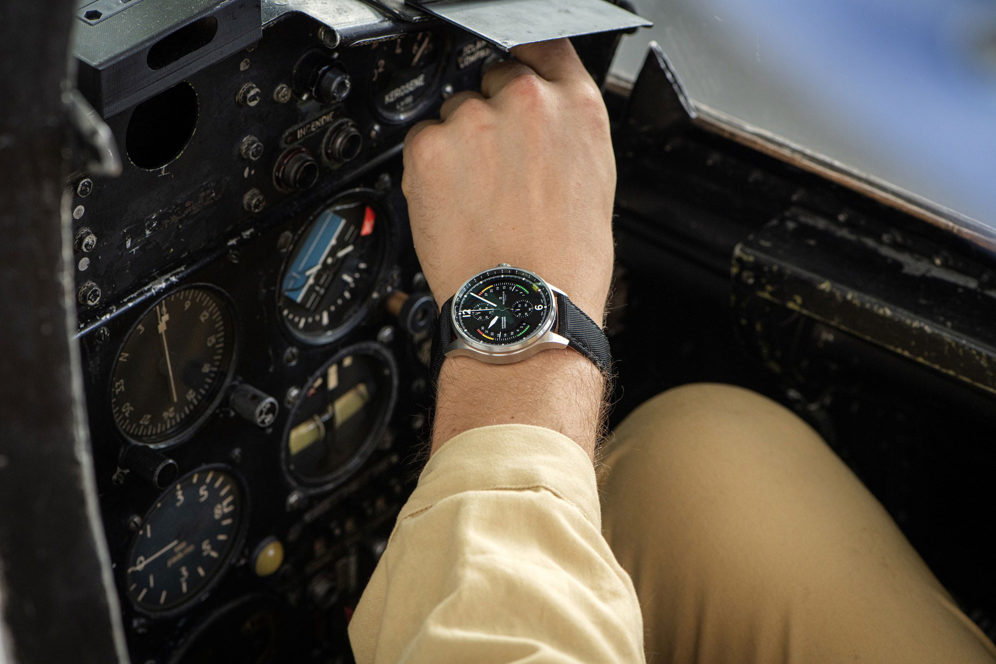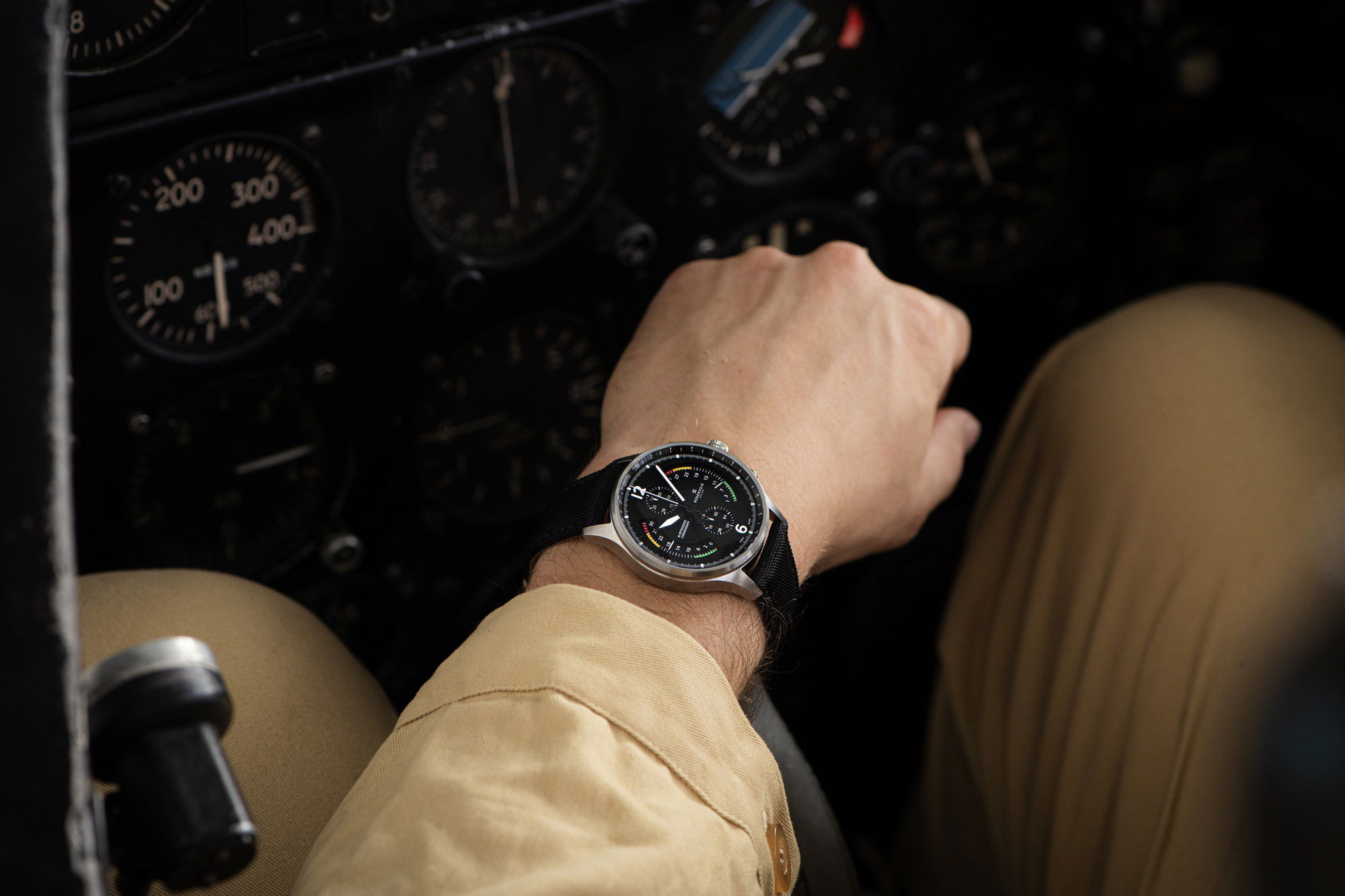 the 2023 aviation-themed innovation: an Airfight Chronograph encased in stainless steel. This marks the debut of a chronograph dedicated to the realm of aviation, celebrating the iconic P-51 Mustang warplane with a utilitarian dial design. Pilots will readily identify familiar elements like the ‘Badin’ airspeed gauge, the vertical speed indicator measuring ascent and descent rates in feet per minute, and the RPM-measuring tachometer. The bezel is adorned with a telemeter scale and is housed in a durable stainless steel case.