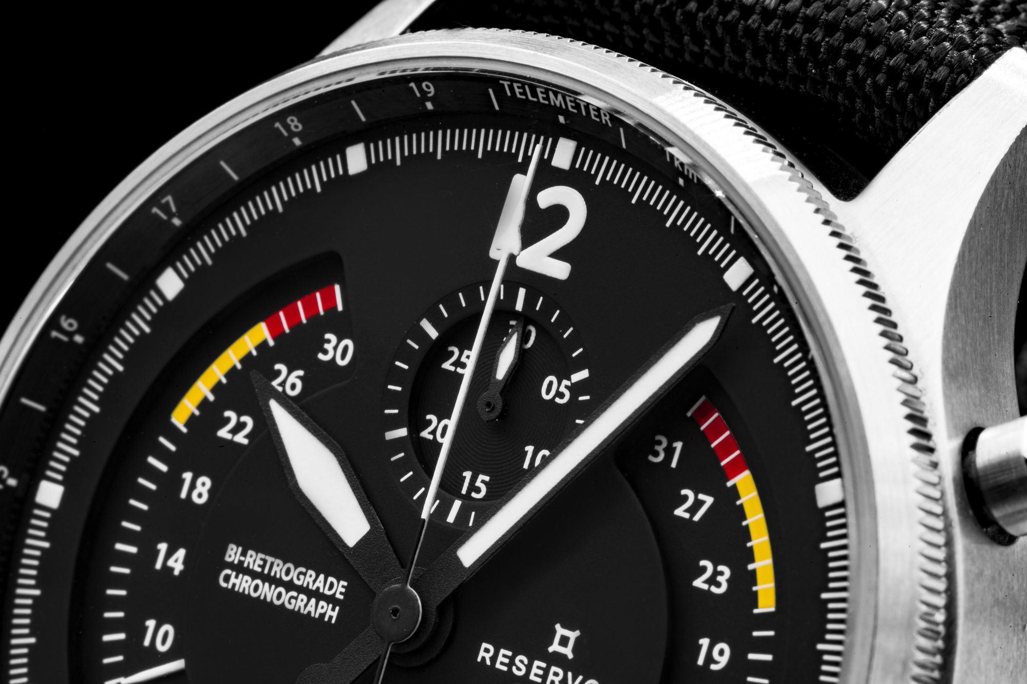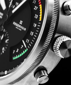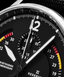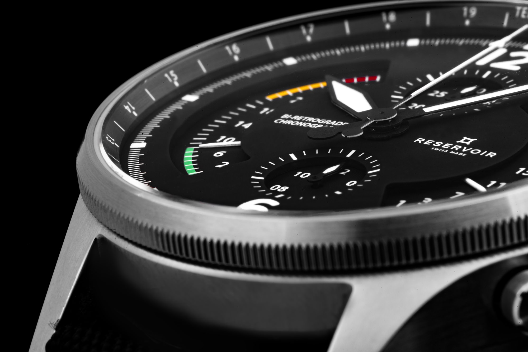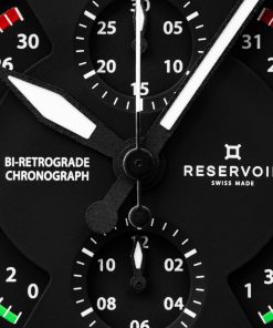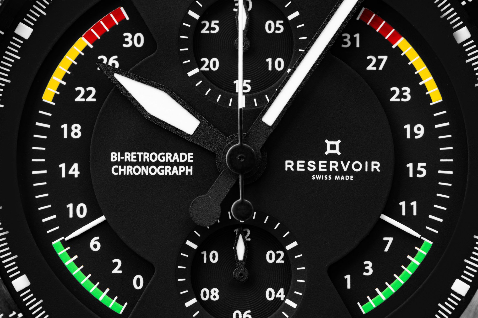 This bi-retrograde timepiece, displaying both date and seconds at 120 degrees, showcases RESERVOIR’s maiden chronograph offering, featuring a central second hand, a 30-minute counter positioned at 12 o’clock, and an hour counter at 6 o’clock. It is powered by the watchmaking caliber RSV-Bi120, a proprietary bi-retrograde chronograph movement with automatic mechanical winding and a column wheel base (LJP-L1C0).
