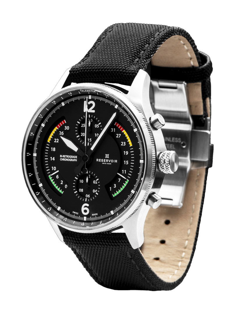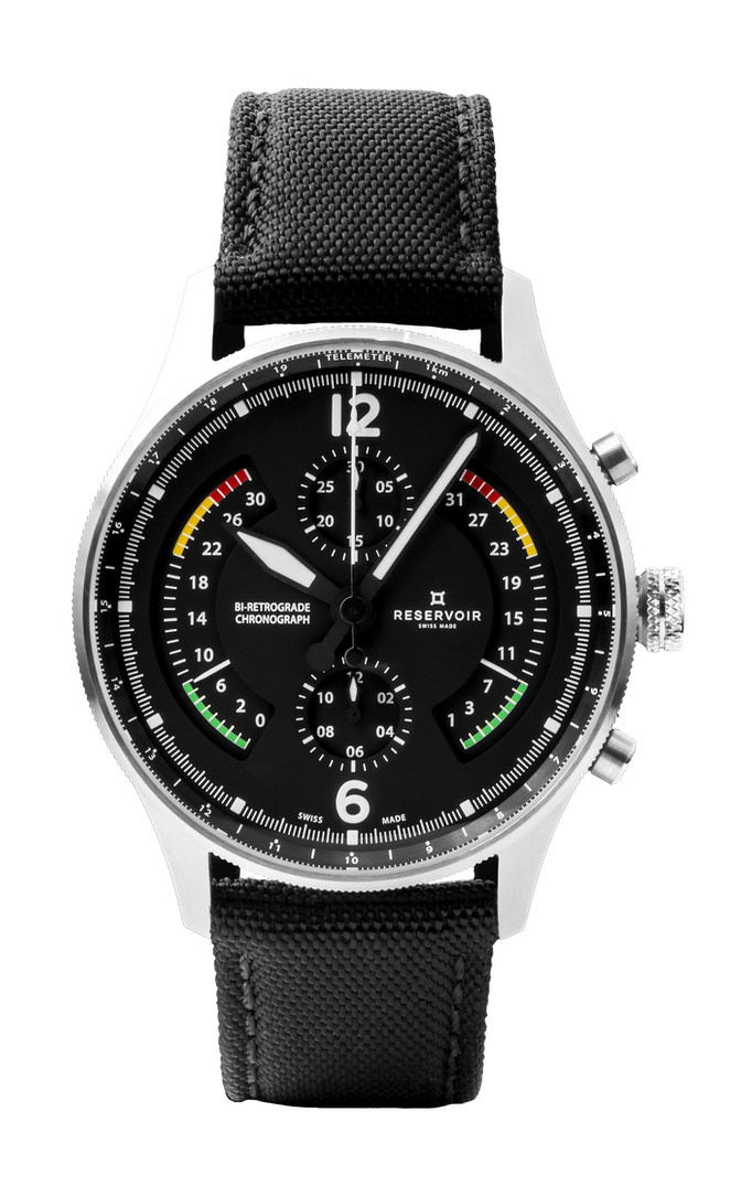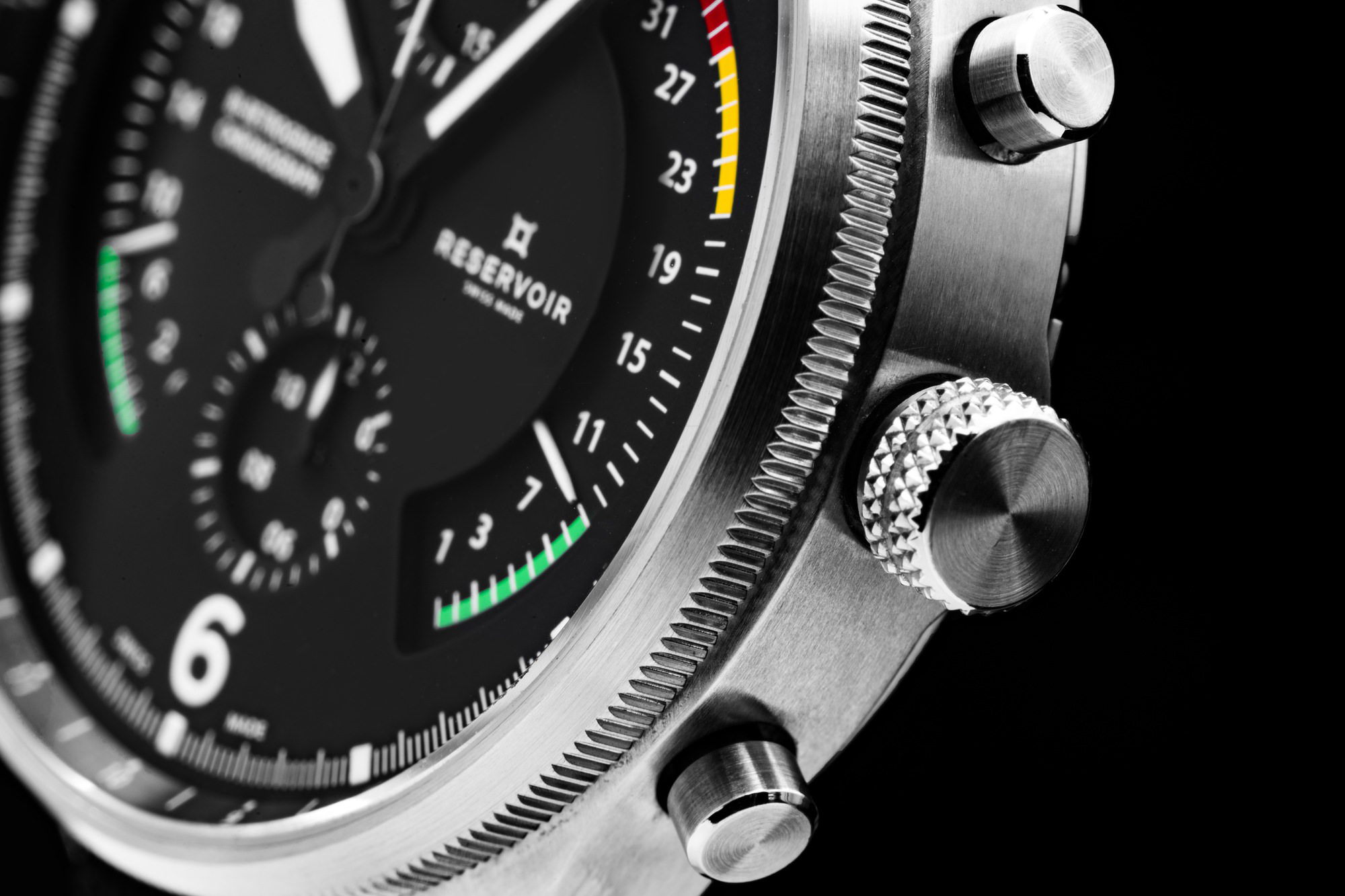 This bi-retrograde timepiece, displaying both date and seconds at 120 degrees, showcases RESERVOIR’s maiden chronograph offering, featuring a central second hand, a 30-minute counter positioned at 12 o’clock, and an hour counter at 6 o’clock. It is powered by the watchmaking caliber RSV-Bi120, a proprietary bi-retrograde chronograph movement with automatic mechanical winding and a column wheel base (LJP-L1C0).