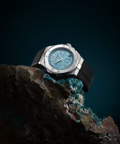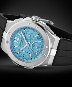 The Chopard Alpine Eagle XL Chrono has recently expanded its palette with the introduction of a ‘Maritime Blue’ version. This precision chronograph showcases a 44 mm diameter case made of Chopard’s unique Lucent SteelTM, a steel type that’s both light-reflective and boasts an 80% recycling rate. The captivating “Maritime Blue” dial, inspired by both the Mediterranean Sea and the Alps, features a sunburst pattern reminiscent of an eagle’s iris. Powering this exquisite timepiece is the Chopard 03.05-C chronometer-certified movement, which is underpinned by three patents, emphasizing its innovative accuracy and functionality. This includes a flyback function, which ensures efficient timing.
