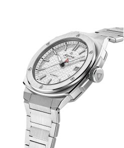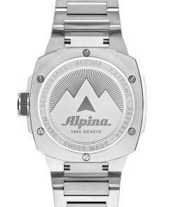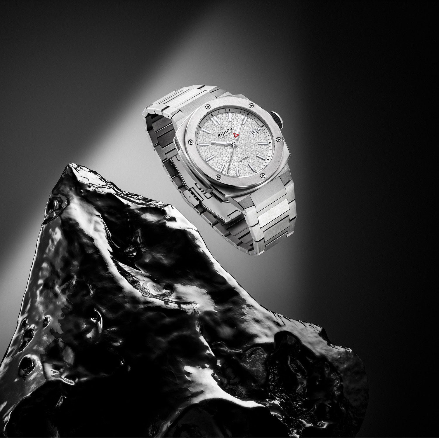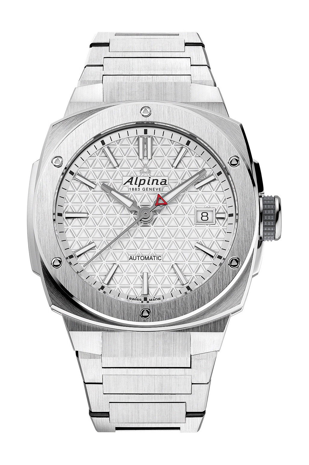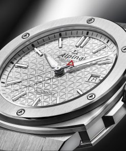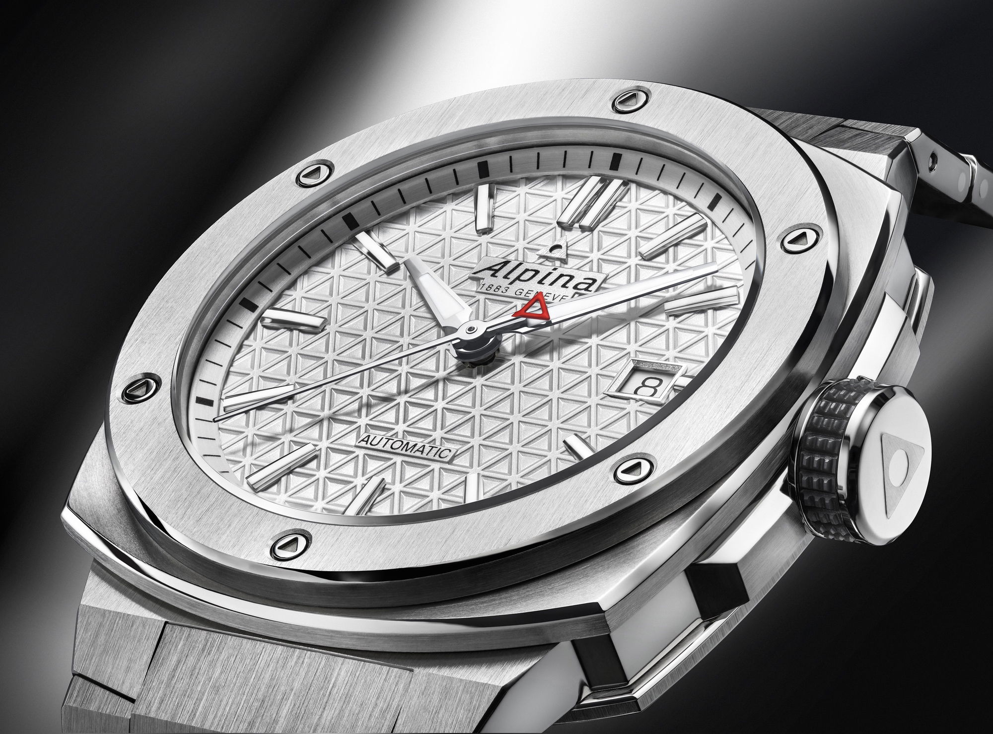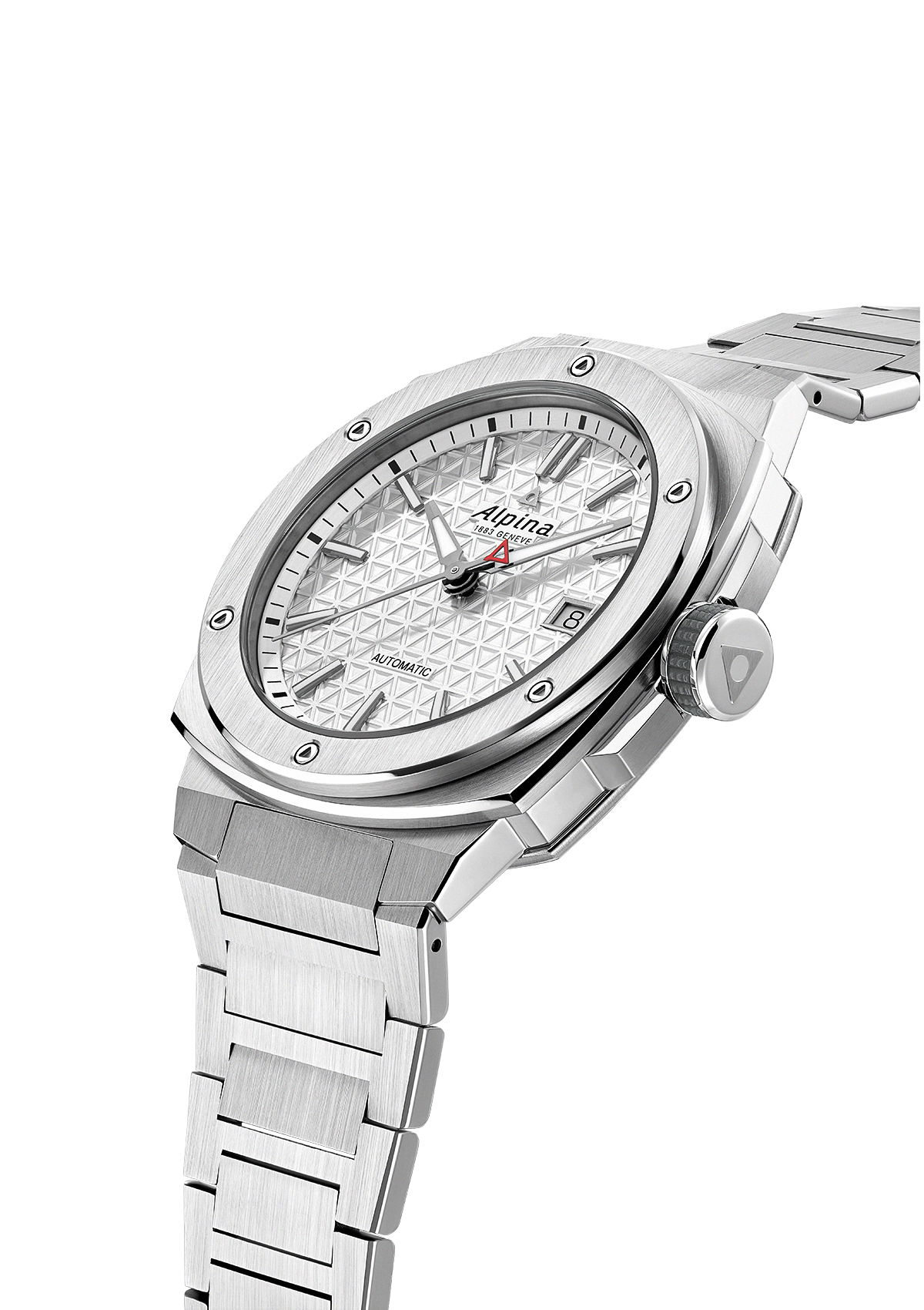 Finished in a satin grey dial embossed with Alpina’s iconic triangle pattern, the watch features luminous markers, a red-tipped seconds hand, and a titanium bracelet that mirrors the steel version’s shape while offering a distinctively lighter touch. Durable, versatile, and unmistakably Alpina.