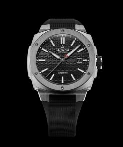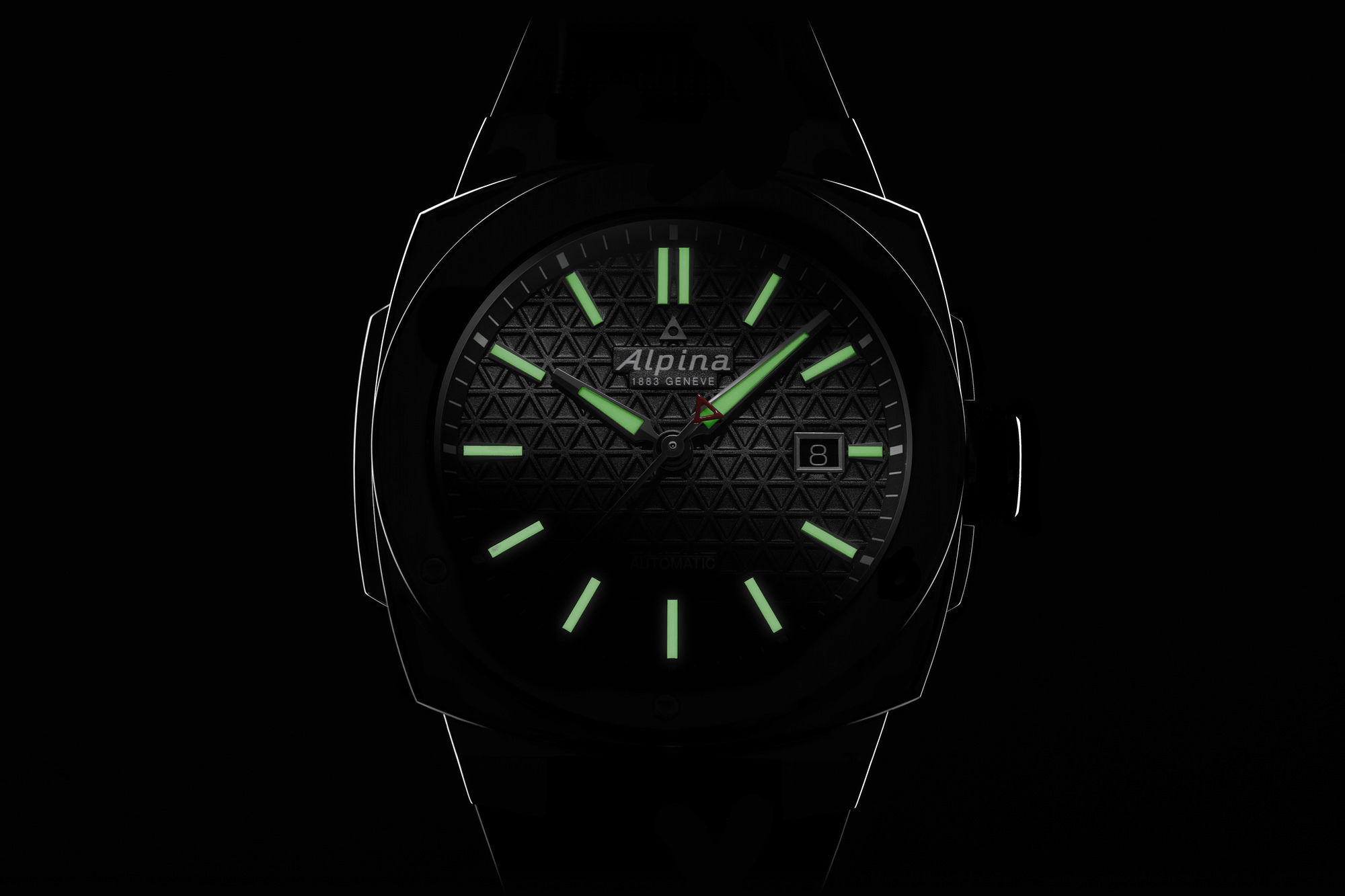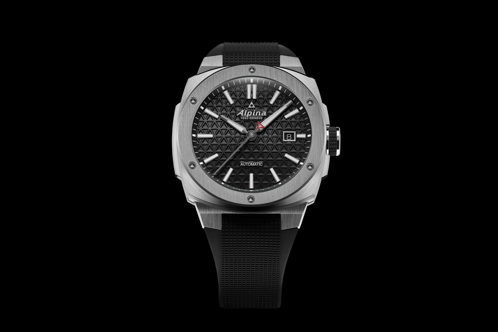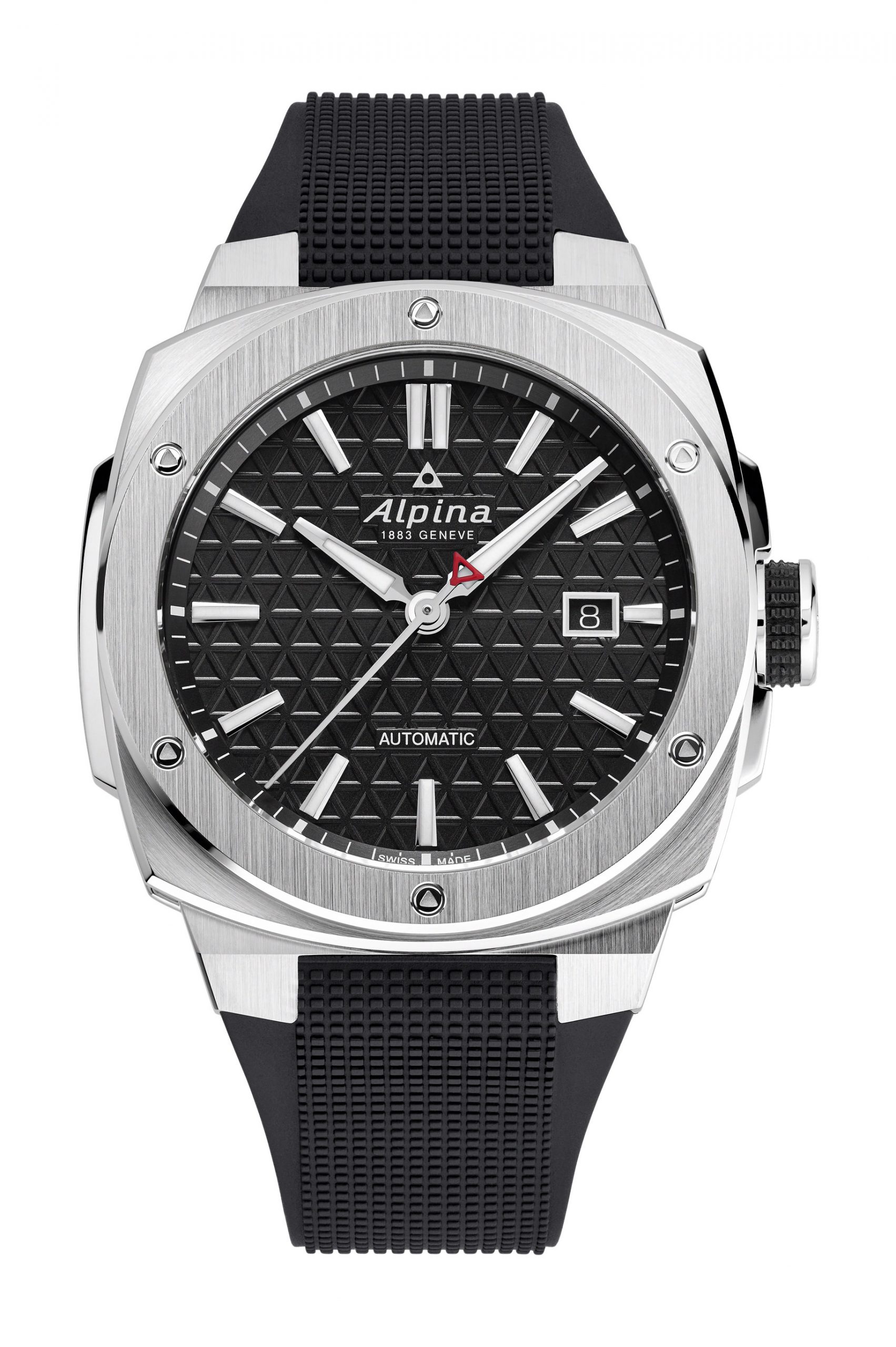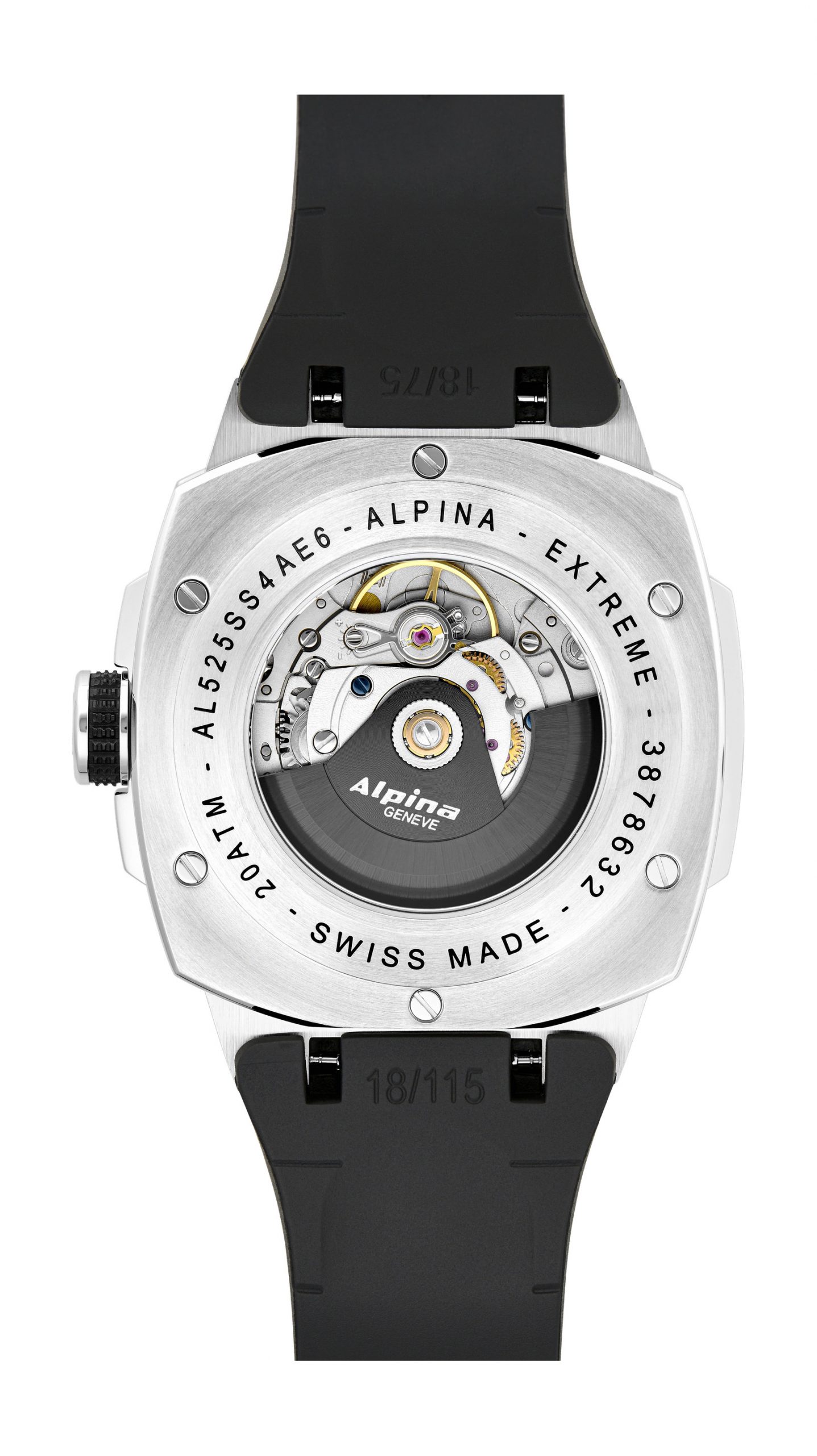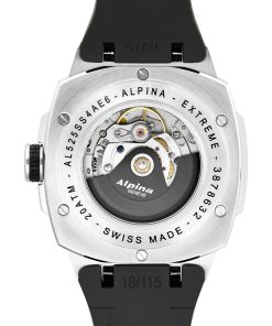 The redesigned Alpiner Extreme Automatic has a 41×42.5 mm steel case with a brushed finish, triangular screws around the bezel, and a choice of black, blue, or green dials. The integrated rubber strap is both comfortable and durable. Water-resistant up to 200 meters, it features luminescent indexes and hands, visible AL-525 caliber movement, and 38 hours of power reserve.