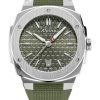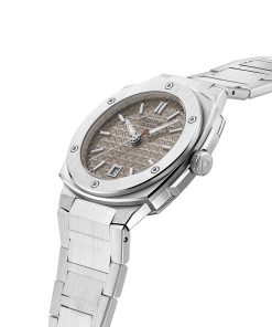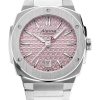 The Alpina Alpiner Extreme comes in four dial options: rock beige, lustrous pink, glacier blue, and verdant green. Each dial features Alpina’s triangular dial pattern and is paired with corresponding steel bracelets or rubber straps.