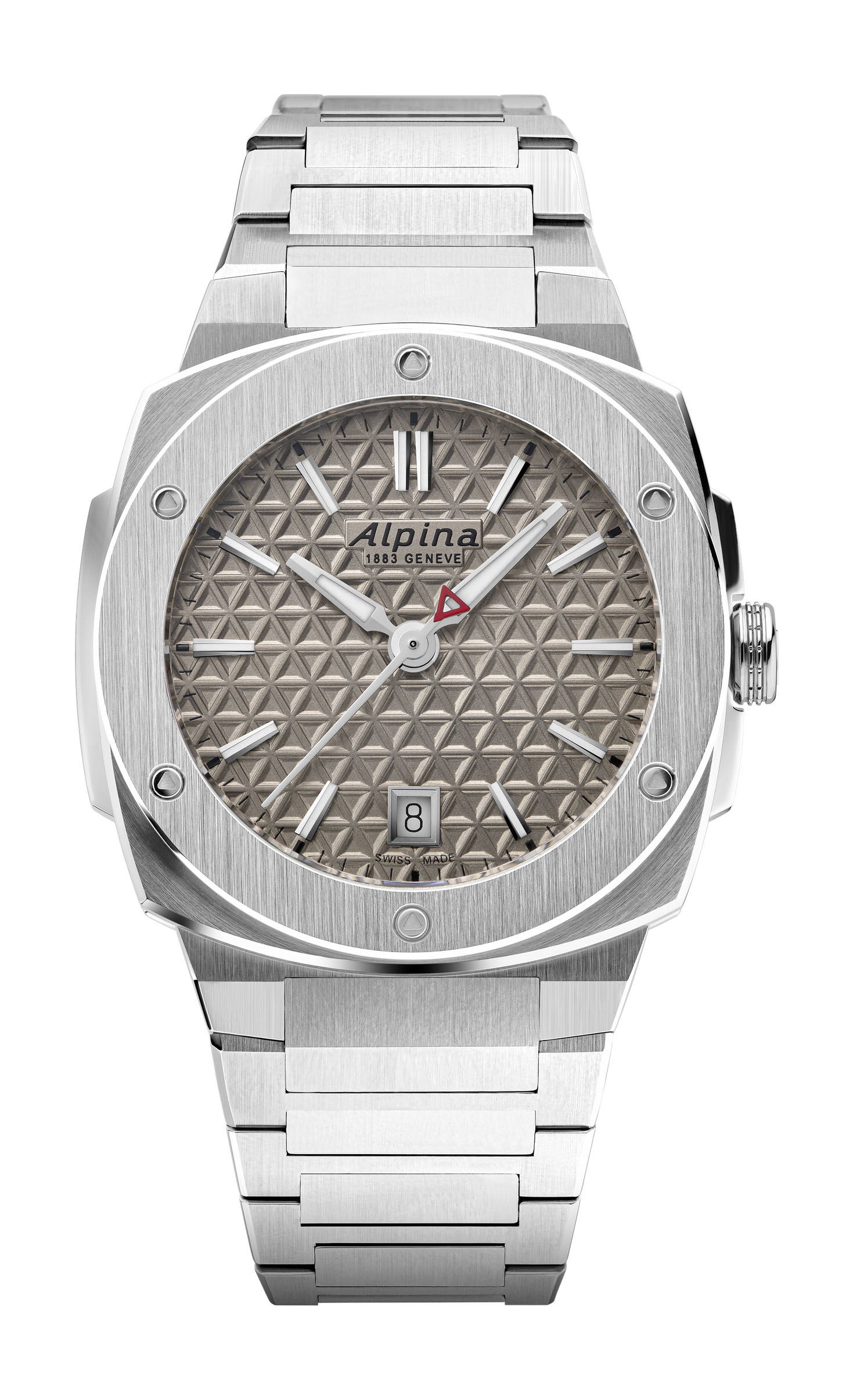 Sporting a robust yet refined appearance, the Alpiner Extreme Quartz has a steel case with alternating satin and polished finishes. The vertical brushed bezel complements the steel bracelet, while the knurled crown ensures a secure grip. Engraved with the Alpina logo, each screw contributes to the watch’s water resistance of 10 ATM.