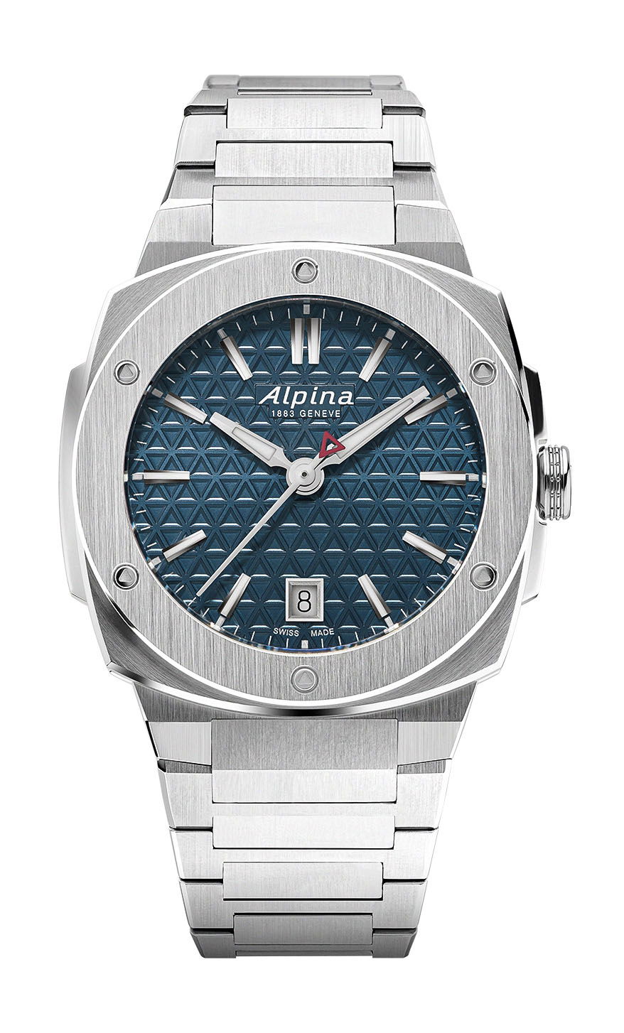 The Alpina Alpiner Extreme comes in four dial options: rock beige, lustrous pink, glacier blue, and verdant green. Each dial features Alpina’s triangular dial pattern and is paired with corresponding steel bracelets or rubber straps.