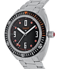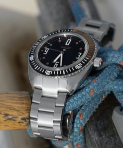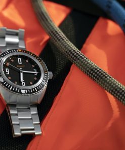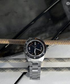 This diver’s watch comes in a stainless steel case and features hands and numerals on the dial coated with luminous paint, all shielded by a sapphire glass. It boasts an impressive water resistance of up to 400 meters (40 ATM). Additionally, a rotating bezel with 15-minute intervals aids divers keep their oxygen levels in check, while a secure screw-in crown prevents accidental underwater openings.