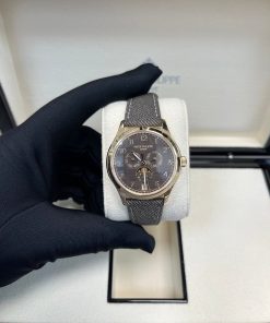 The warm glow of rose gold is elegantly combined with a brown dial enhanced by a double vertically and horizontally satin-brushed finish reminiscent of shantung silk fabrics. The brown calfskin strap with denim pattern and contrasting cream stitching is fitted with a rose gold prong buckle.