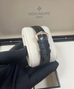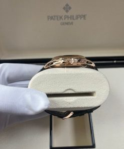 The transparent sapphire crystal enables one to admire self-winding Caliber 324 S QA LU 24H, equipped with the ingenious patented Patek Philippe Annual calendar mechanism requiring only one manual adjustment per year, at the end of the month of February.