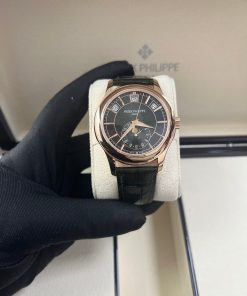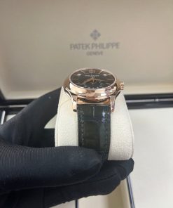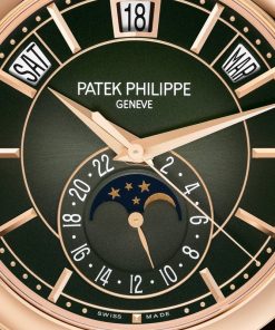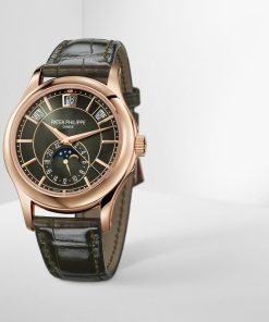 Annual Calendar Reference 5205, with its day/date/month apertures arranged along the arc of a circle, was launched in 2010 as two white gold versions. In 2022, Patek Philippe revisits this model in an original and contemporary color. The case is distinguished by its concave bezel, its hollowed flanks and its skeletonized lugs. This refined architecture is entirely hand-polished by the artisans of the Manufacture. The olive green dial is enlivened by a sunburst motif and by a black gradient around the rim. The day/date/month apertures in the upper part ensure perfect readability of the Annual Calendar indications, with a rose gold frame at 12 o’clock accentuating the most important item of information, the date.