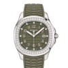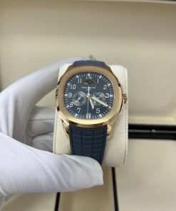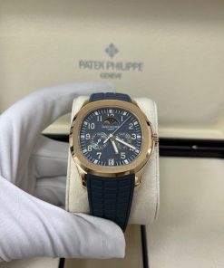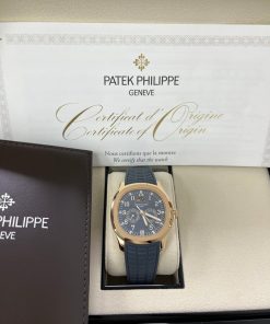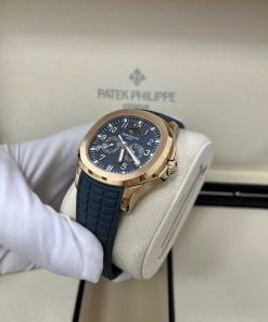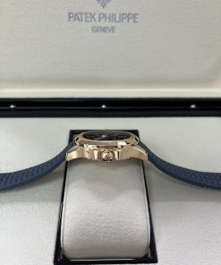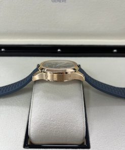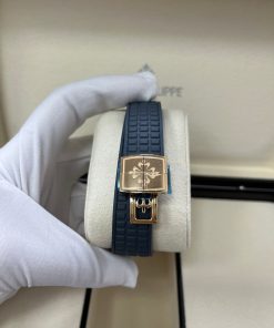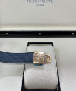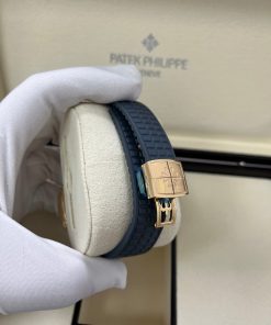 This new Patek Philippe Ladies Aquanaut features the patented Annual Calendar: a complete day/date/month calendar requiring only one manual correction per year, at the end of February. The iconic design of the 39.9mm rose gold case and bezel with a rounded octagonal shape is enhanced by the contrast between polished and satin-brushed finishes. The contemporary “sporty chic” style is reinforced by the blue-gray dial and composite strap with Aquanaut pattern.