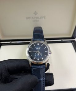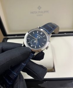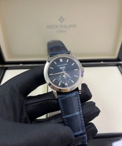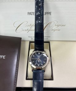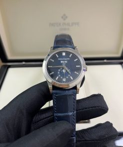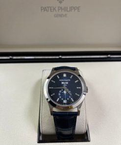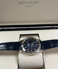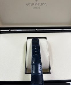 Patek Philippe reinterprets its famous men’s Annual Calendar Reference 5396 in a new white gold version featuring a sunburst blue dial with black-gradient rim, discreetly enhanced by the brilliance of twelve baguette diamond hour-markers (0.26 ct). The dial color is echoed by a shiny navy-blue alligator leather strap.