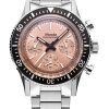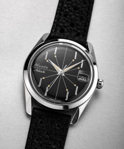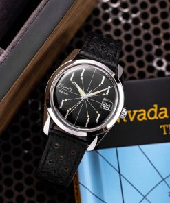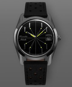 Powered by the manually wound Landeron 21 caliber, the watch features a slim 7mm case thickness (10.1mm including the crystal).