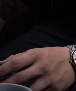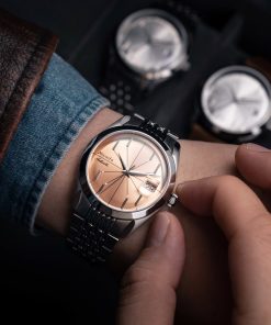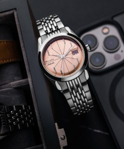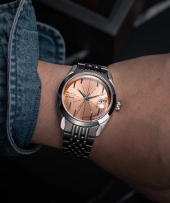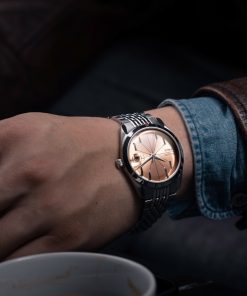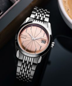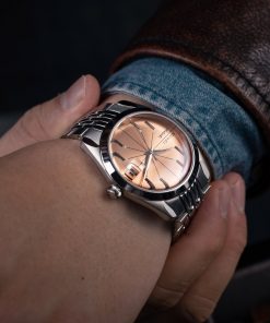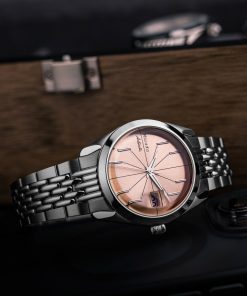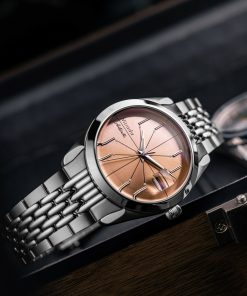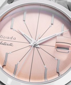 The Antarctic Salmon Spider watch has a striking design, highlighted by its salmon-colored dial with slim baton indexes arranged in a pattern reminiscent of a spider. Encased within a 38mm stainless steel case and protected by a double-domed sapphire crystal, this timepiece is both sophisticated and eye-catching. With a water resistance of up to 100 meters, it’s equipped for everyday wear. Powered by a Swiss-made SOPROD P024 self-winding movement, the watch comes alive with its precise timekeeping.