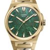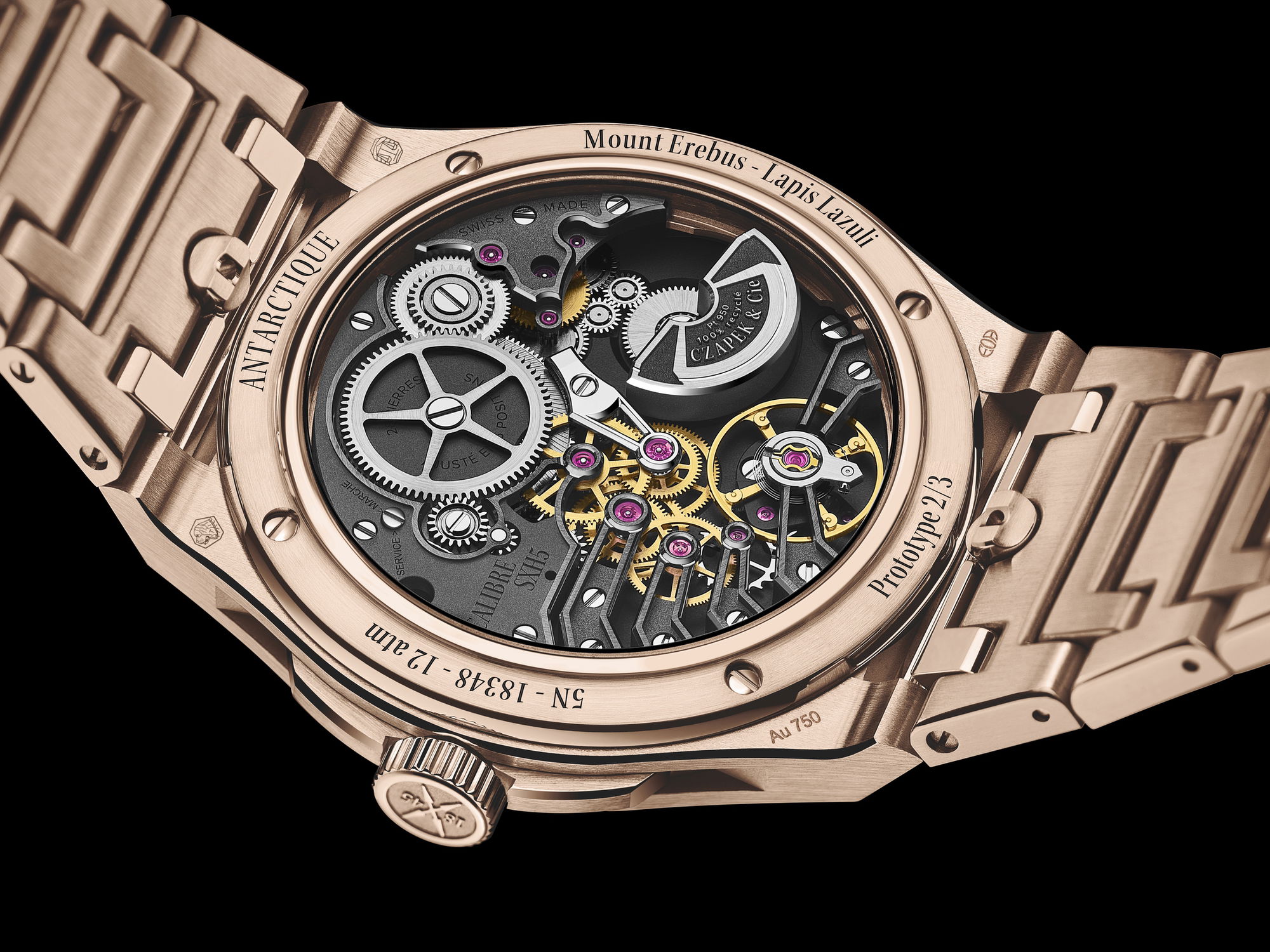 The new models include the Mount Erebus Lapis Lazuli in rose gold, its dial cut from deep-blue stone flecked with golden pyrite, and the Mount Erebus Falcon Eye, also in rose gold, with a dial that shimmers in layered tones of anthracite, blue, and bronze. Both stones are notoriously difficult to master: lapis can fracture in cutting, while falcon eye yields very few flawless dials. The third, the Mount Erebus Green Meteor, brings back the steel meteorite edition of last year in a new yellow-gold case, its Gibeon meteorite dial acid-etched, lacquered in translucent green, and alive with crystalline Widmanstätten patterns.