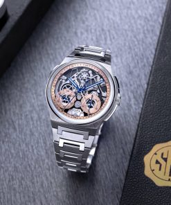 The Czapek & Cie Antarctique Rattrapante Gold Dust SHH Edition is a limited 25-piece timepiece, exclusive to Sincere Fine Watches’ SHH boutique in Kuala Lumpur. This unique edition features solid 18-carat 5N rose gold on the chronograph counters and peripheral minutes ring, offering a striking contrast to the grey and silver movement, case, and bracelet. This design choice echoes the luxury and creativity of the SHH boutique.