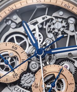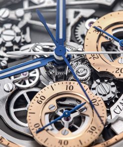 Functionality includes a minute totalizer at four o’clock and small seconds at seven o’clock, emphasizing layout symmetry. The movement uses a horizontal clutch for its aesthetic appeal, with column wheels anchoring the movement, reflecting the influence of François Czapek’s 19th-century designs.
