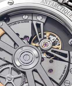 This Antarctique Rattrapante Gold Dust SHH Edition is a split-second mono-pusher chronograph, showcasing its intricate mechanism through the dial. Created in partnership with Chronode, it is powered by the proprietary calibre SHX6, a double column-wheel chronograph movement. The Antarctique Rattrapante’s design maintains a balance between high-end mechanics and refined aesthetics, highlighted by a 42.5-millimeter case and visible movement components, including a tripod bridge, satellite minute train, and a patent-pending split-second mechanism.