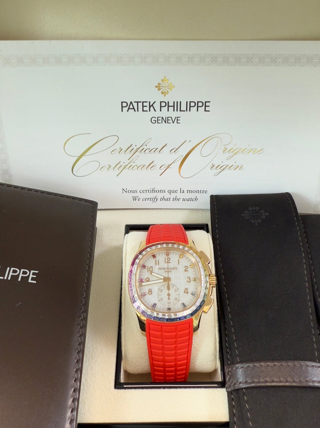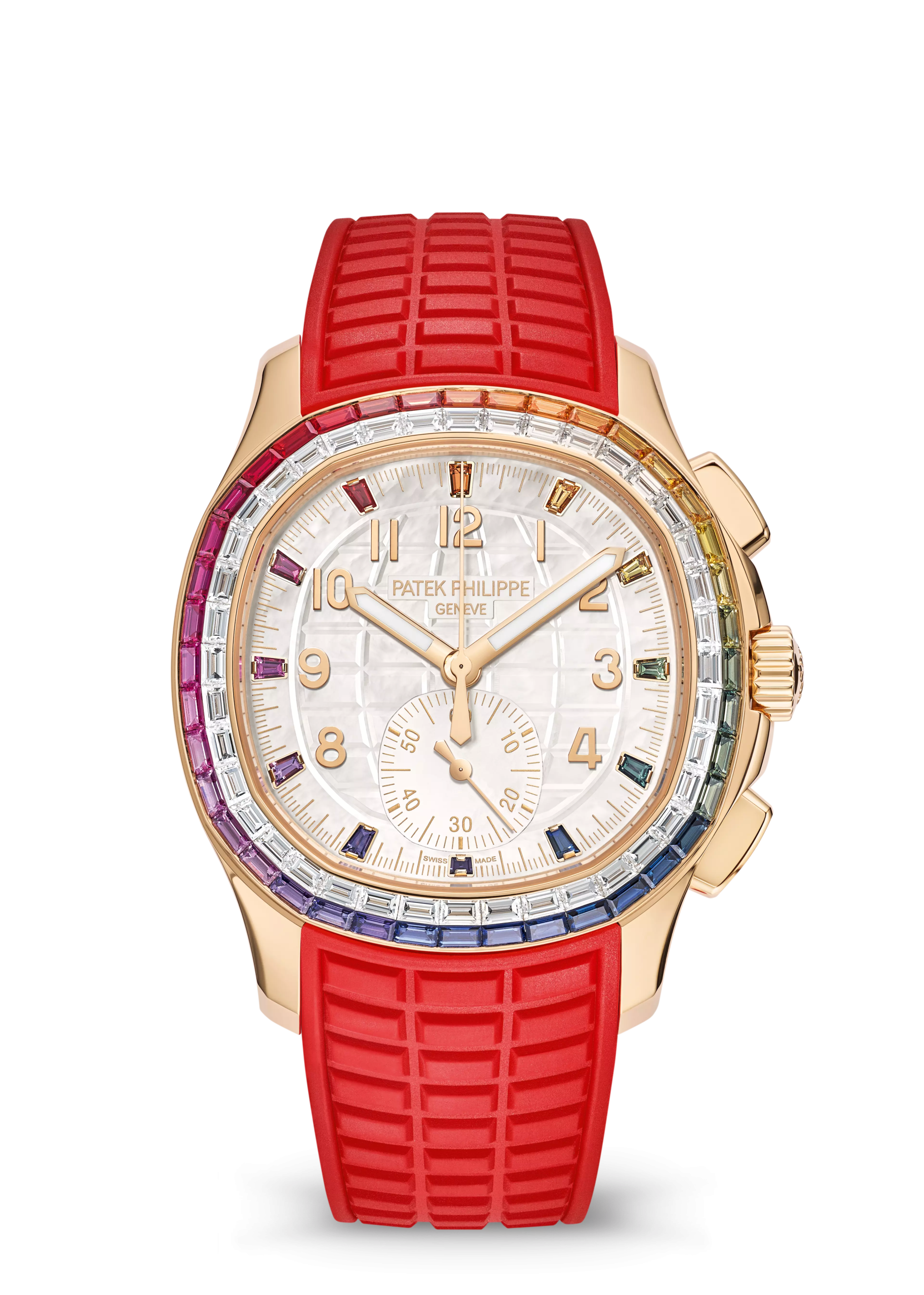The Ref. 7968/300R-001 Aquanaut Luce “Rainbow” chronograph in rose gold was created especially for modern, active women. It features a rainbow consisting of baguette diamonds and multi-colored sapphire that are invisibly set.