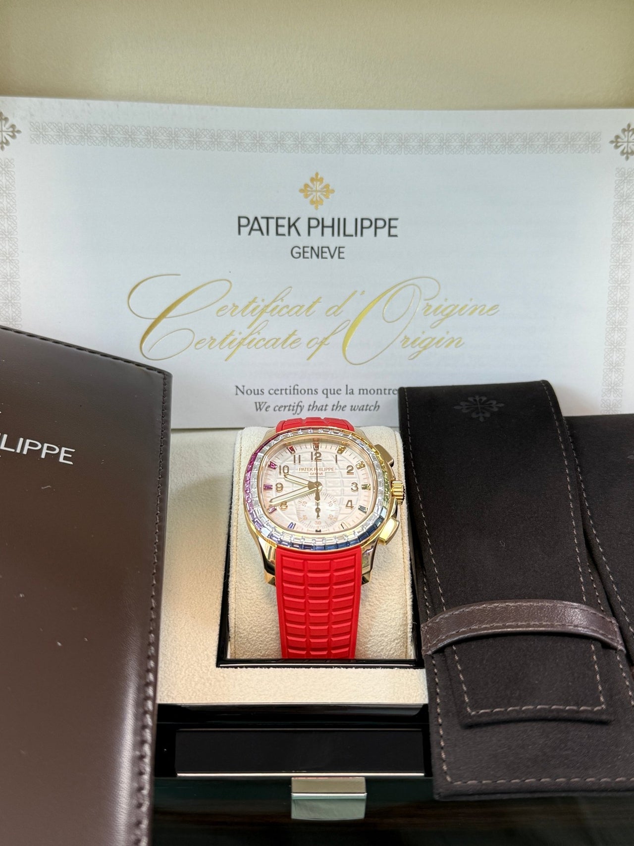 White mother-of-pearl, engraved with Aquanaut pattern, baguette multicolored sapphire hour markers and gold applied numerals.