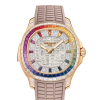 The first minute-repeater in the Aquanaut Luce “contemporary casual chic” line for ladies, this model is also distinguished by its Haute Joaillerie adornment combining baguette-cut diamonds and multicolored baguette-cut sapphires set using the sophisticated “invisible setting” technique. The sapphire crystal case-back reveals the self-winding movement with its two classic gongs.
