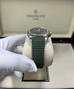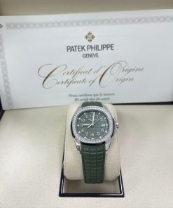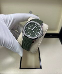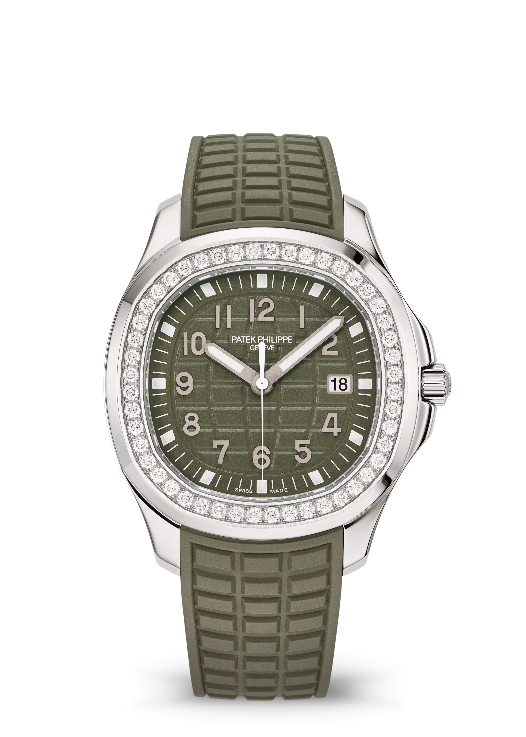 Patek Philippe reinterprets the quartz Aquanaut Luce in stainless steel with a larger diameter (38.8 mm) and a new integrated composite strap. This epitome of contemporary casual chic is attired in a bold khaki-green color adorning the dial and matching strap. Water-resistant to 120m, the rounded octagonal case is enhanced by polished and satin finishes. The bezel is lit up by a row of 48 diamonds (~1.11 ct). The patented folding clasp is secured by four independent catches.