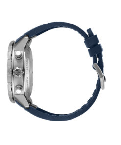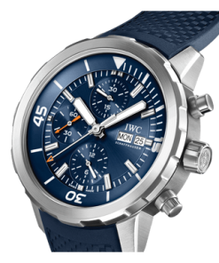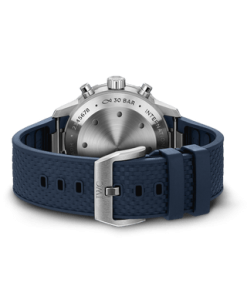 This Aquatimer Chronograph is water-resistant to 30 bar and features a stainless steel case, a blue dial, and a blue rubber strap