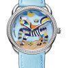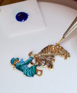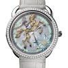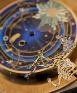 Inspired by the Chorus Stellarum silk scarf by Daiske Nomura, the watch features two exclusive interpretations, each showcasing a decorative world that ranges from fantasy to futuristic. The characters depicted on the watch, such as skeleton riders on noble steeds, are in mobile yellow gold appliques that move in response to a pusher at 9 o’clock, creating a smooth animation. This animation takes place against a backdrop of a gilded constellation, crafted using the champlevé technique, with colorful lacquer-coated motifs representing a celestial painting.
