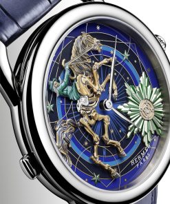 The Hermès ARCEAU Chorus Stellarum watch is a blend of traditional craftsmanship and whimsical design, centered around an equestrian theme. Despite its classic appearance, it incorporates playful elements, such as mobile appliques, engraving, and miniature painting, bringing the watch to life in a mischievous universe.