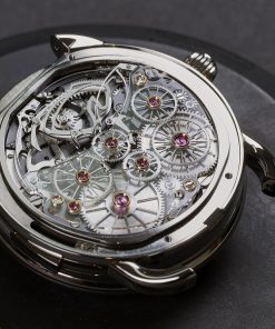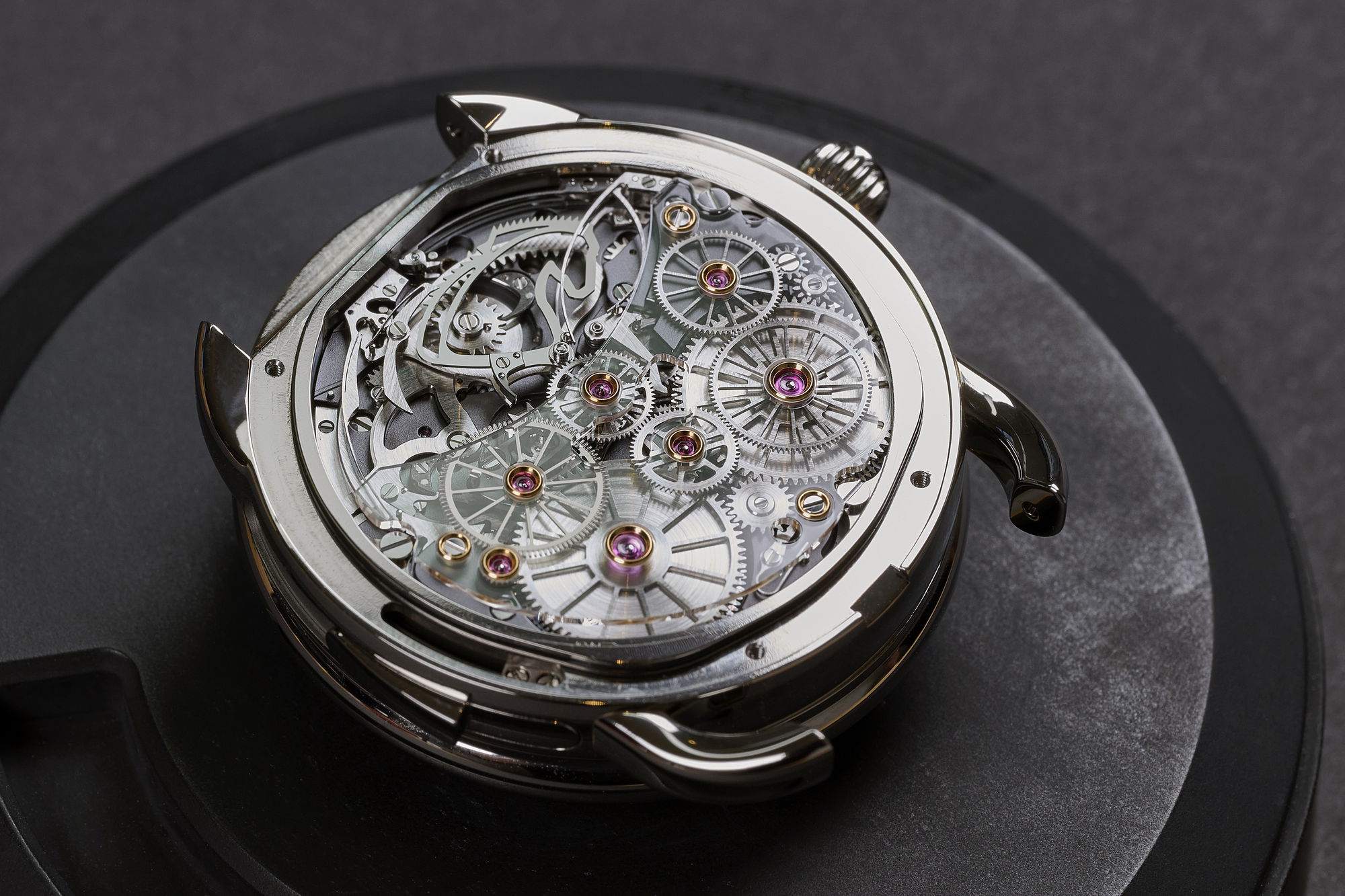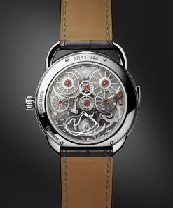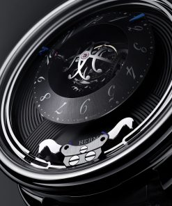 The triple-axis tourbillon and ‘tuning-fork’ minute repeater, both high-frequency complications, are showcased on the dial side, with the tourbillon housed under a sapphire dome with interlacing double “Hs”. The tourbillon, with three separate axes and rotation speeds, operates within a curved hour-circle, while the hours-minutes display features Arabic numerals and claw-shaped hands. The minute repeater, activated via a slide on the case, chimes hours, quarters, and minutes with hammers sculpted like horses. The case material enhances acoustic resonance, and the hand-wound movement ensures precision timing. The sapphire case-back reveals intricate gear designs inspired by the Duc attelé carriage, with anthracite PVD-treated mainplate and bridges, and openworked sapphire-crystal strikework bridge.