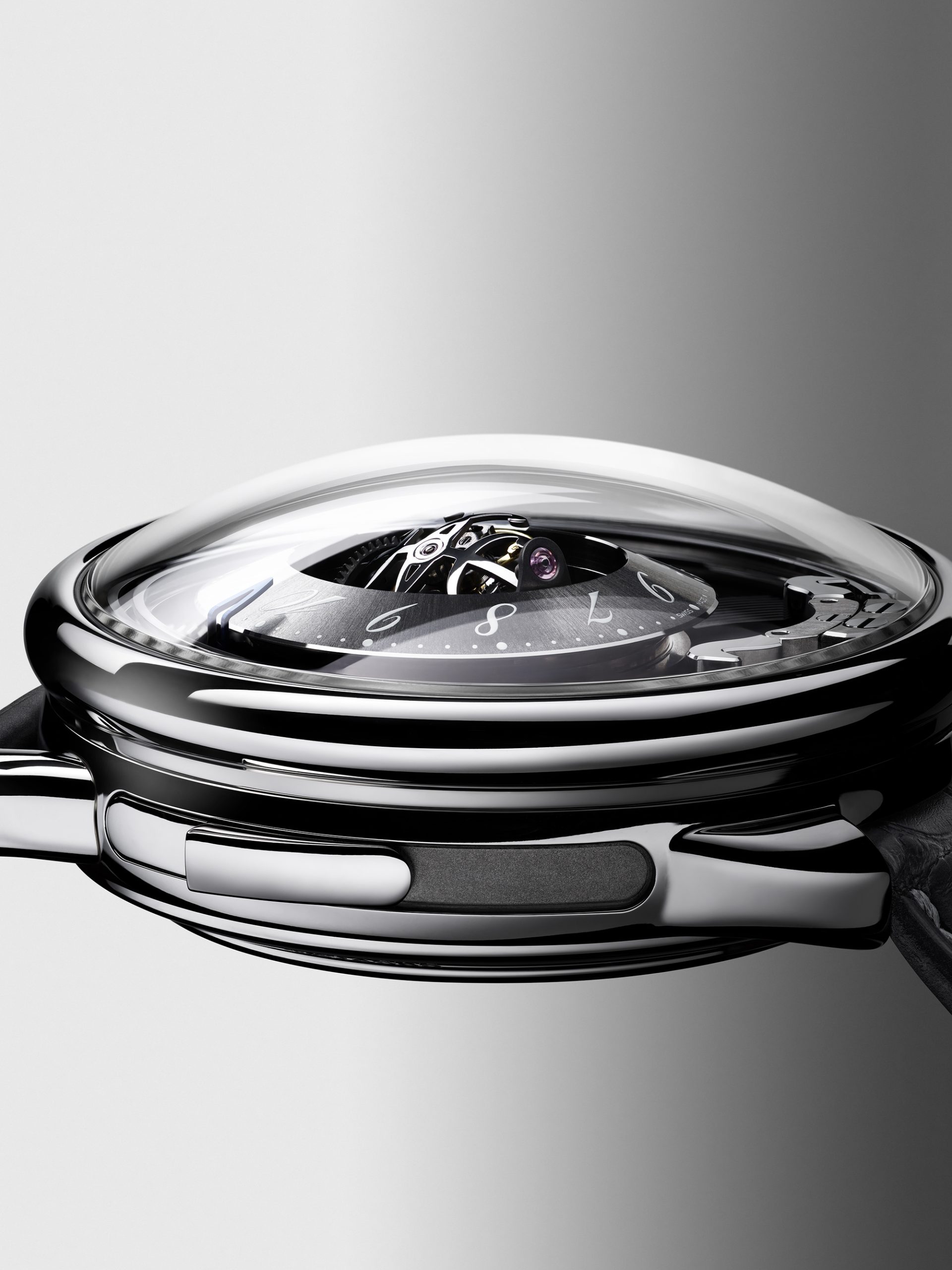 The ARCEAU Duc Attelé watch is a fusion of Haute Horlogerie and equestrian motifs, featuring a triple-axis tourbillon and a minute repeater. Designed by Henri d’Origny in 1978, its classic Arceau watch design with asymmetrical stirrup lugs is updated with a 43 mm polished titanium or rose gold case.