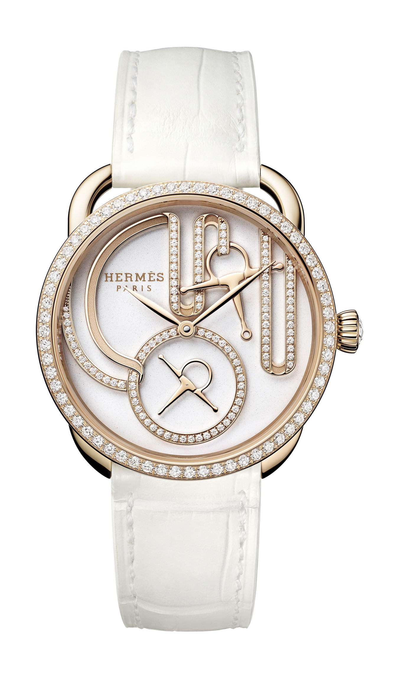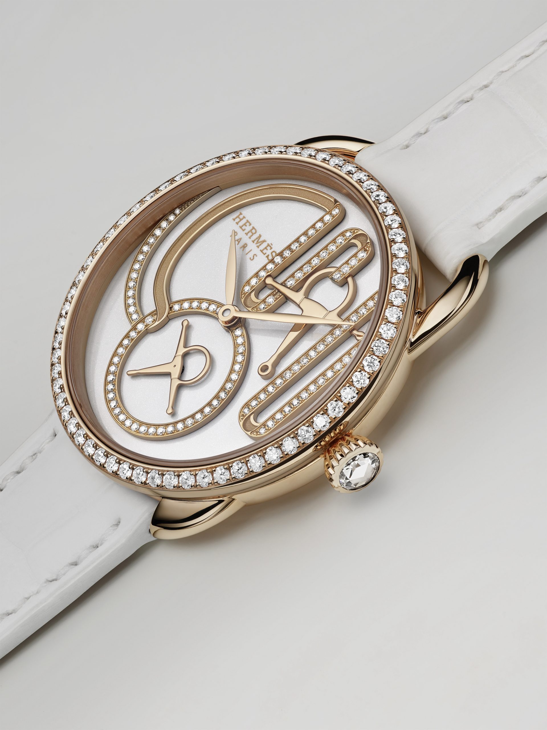 Designed by Henri d’Origny in 1978, the Arceau watch embodies Hermès’ timeless style with its round shape and ‘stirrup’ design. The rose gold case, set with 64 diamonds and a gem-set crown, frames the white lacquered or black dial.