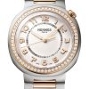 On the dial, bridles and bits in rose gold and 110 diamonds create a delicate pattern, complemented by a bit-shaped seconds hand. The watch is powered by the Manufacture Hermès H1912 movement, visible through the sapphire crystal case-back. It is finished with a smooth chantilly or black alligator strap, matching the dial’s color.