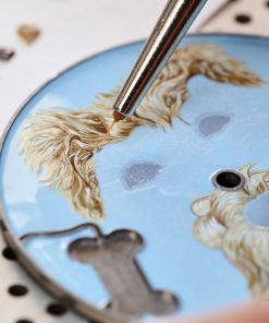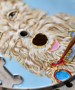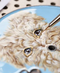 Each dog showcases a different artisanal mastery. Orson, crafted in wood marquetry, is assembled from eight varieties of wood, each detail carefully cut, placed, and painted to create texture and depth. Amy, with her bright spectacles, is born of engraving and enamel painting, where layers of colour and delicate brushwork capture her lively expression. Taco, the most exuberant of the trio, comes to life in miniature cloisonné enamel, his white coat and golden-lined fur built up through successive firings in vivid shades of blue and white.