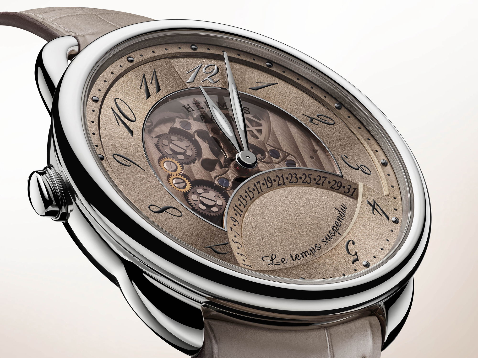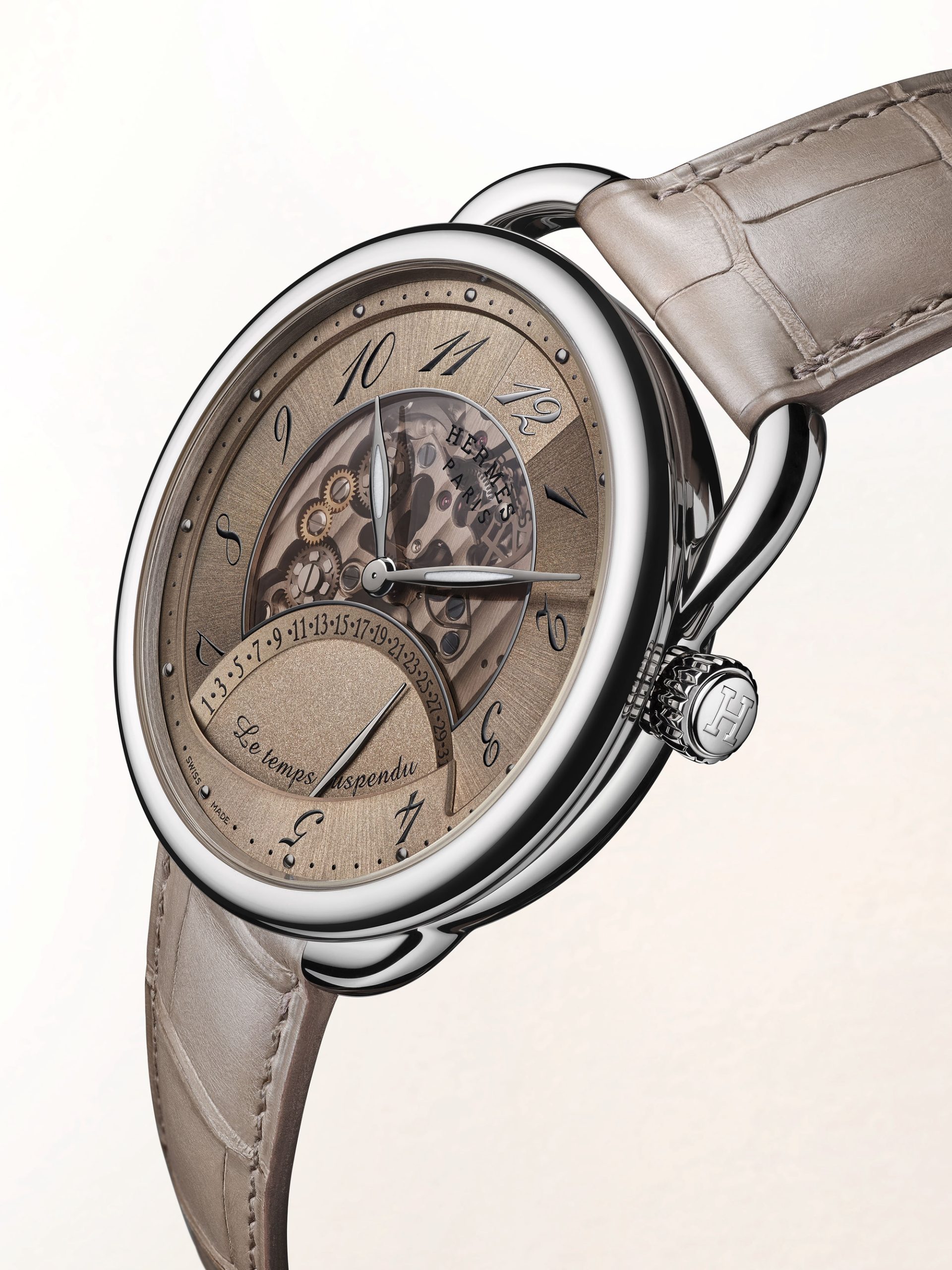 In 2025, Hermès revisits the art of pausing time with a renewed vision. More than just a mechanical feat, Le temps suspendu dares to break free from conventional timekeeping, encouraging its wearer to embrace the present moment. In a world where every second is counted, Hermès offers time that truly matters. Originally launched in 2011, this whimsical complication reimagines time not as a constraint, but as a companion—bending the rules to honor the now. By playing with this paradox, it reminds us that the moments we forget are often the ones we hold most dear. This year, Hermès breathes new life into the concept with a redesigned Arceau.