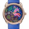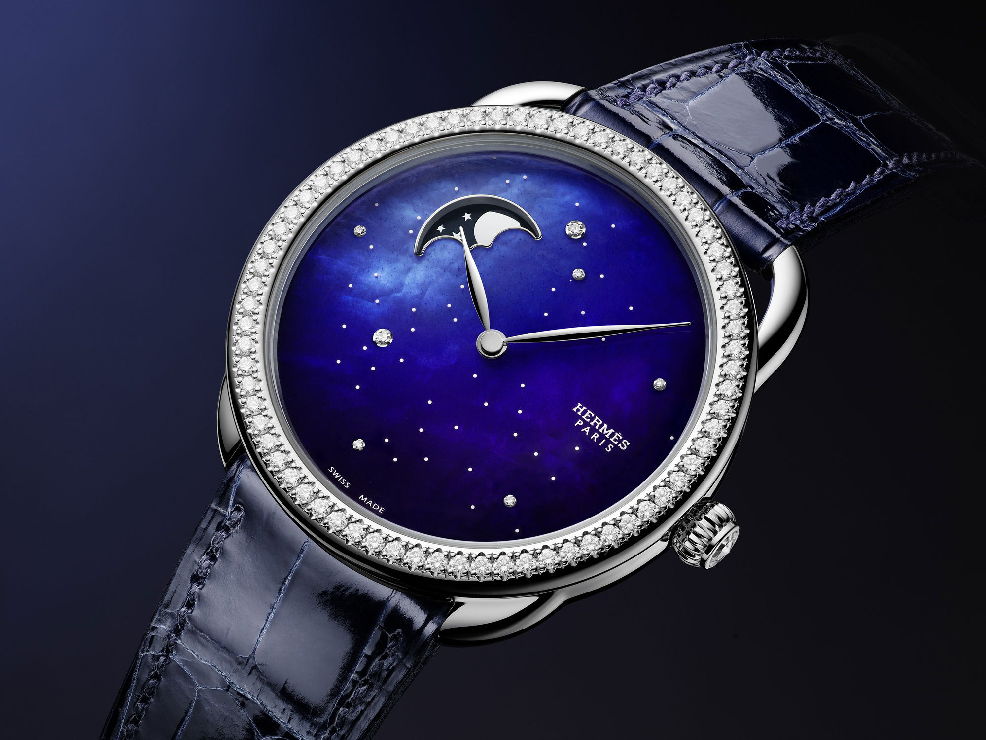 The dial, evocative of a star-filled night sky, is made from textured mother-of-pearl with varying shades of blue lacquer, producing an enchanting chiaroscuro effect. It highlights a radiant moon and a constellation of seven diamonds, adding to its celestial allure. Delicate leaf-shaped hands glide over this starry backdrop, powered by the precise Hermès H1837 movement. This mechanism not only drives the time and moon-phase functions but is also beautifully showcased through the sapphire crystal case back, revealing detailed finishes and the distinctive ‘sprinkling of Hs’ motif. Complementing the Arceau Petite Lune’s deep, rich hues is a sapphire-blue alligator strap, a testament to Hermès’ expertise in saddlery and leatherwork.
