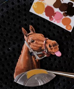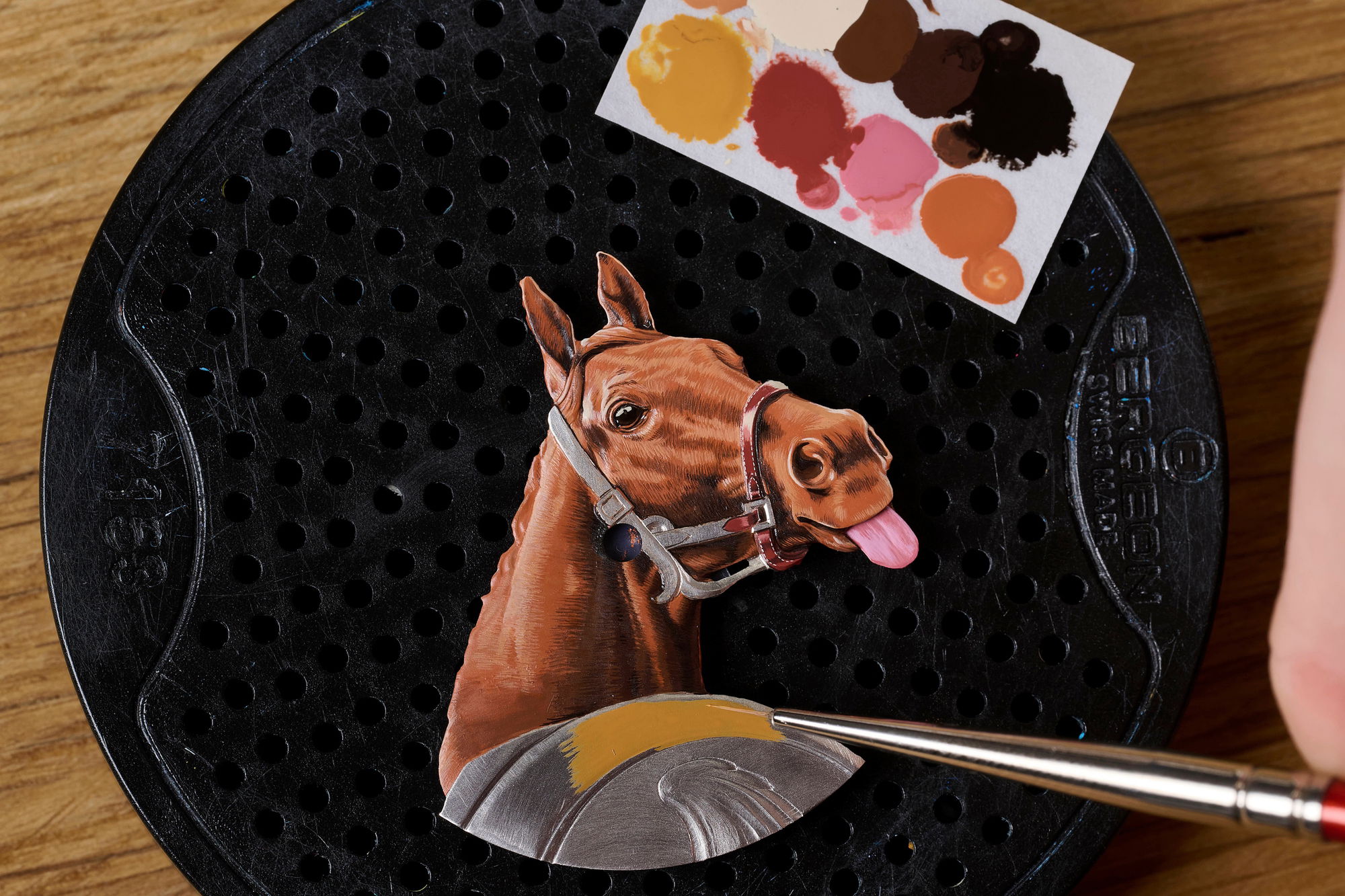 The animation is activated by a pusher at 9 o’clock, where the horse cheekily sticks out its tongue on cue. This mobile element is sculpted with traditional burins, hand-painted in micro-layers and kiln-fired to reveal depth and vivid tones. The backdrop, a weave of vibrant horsehair, enhances the composition’s texture and energy. Every element on the dial is created by hand, uniting techniques that demand both precision and patience.
