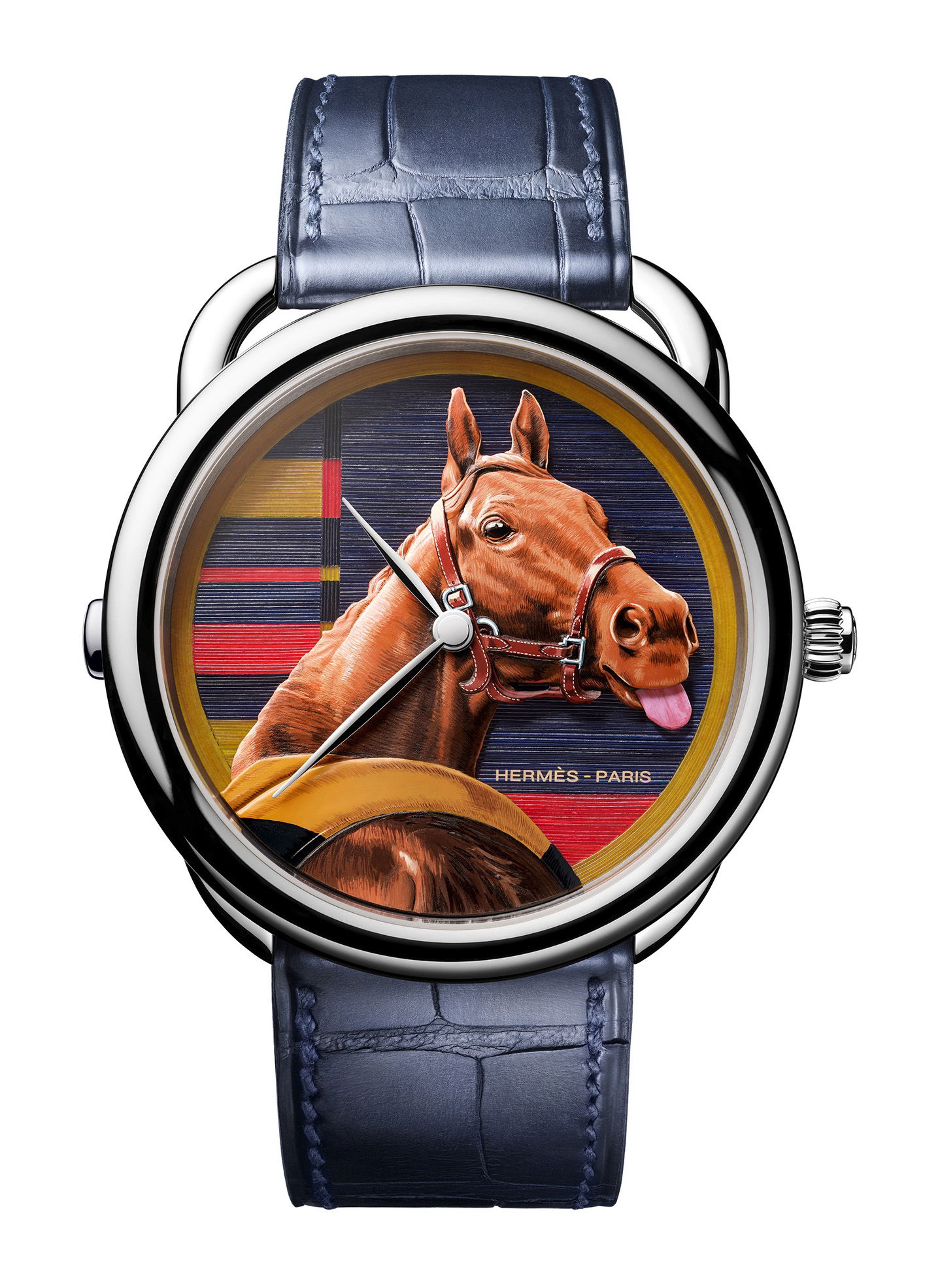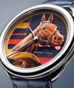 Hermès revisits the Arceau design by Henri d’Origny with a new interpretation titled Arceau Rocabar de rire, blending fine watchmaking with the playful spirit of the house. At its center, a cheeky horse drawn from Dimitri Rybaltchenko’s Rocabar de rire silk scarf takes shape through horsehair marquetry, engraving and miniature painting. Set within a 41 mm white or rose gold case, the watch balances humour and heritage, echoing the striped saddle blankets of Hermès tradition with strands of horsehair placed one by one onto the dial.