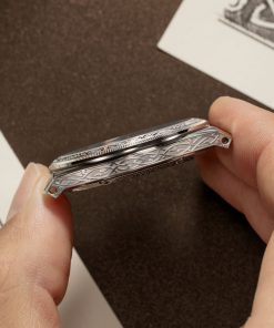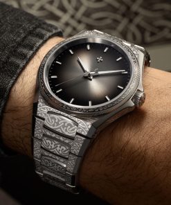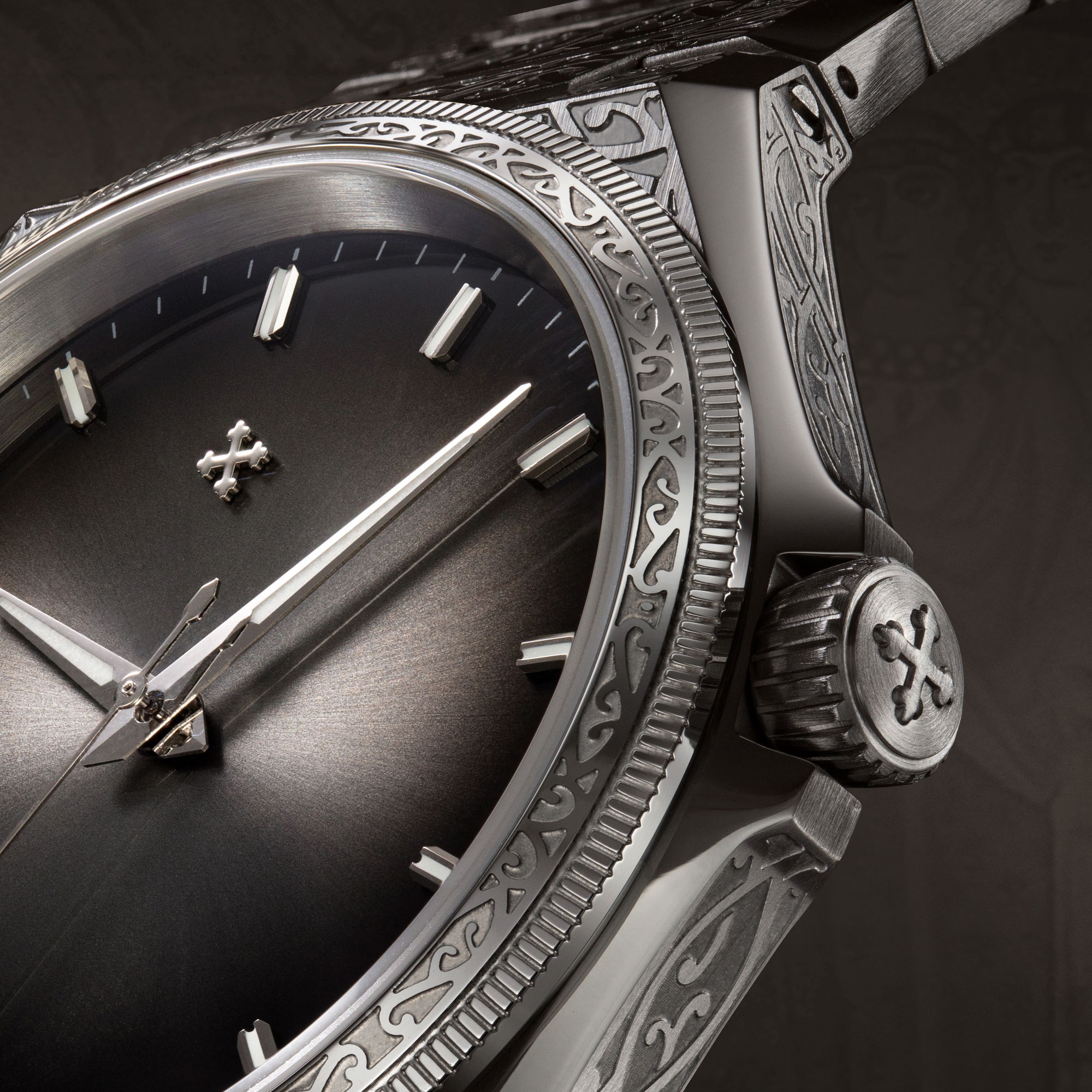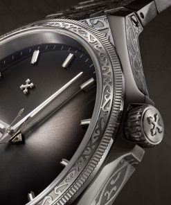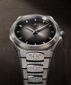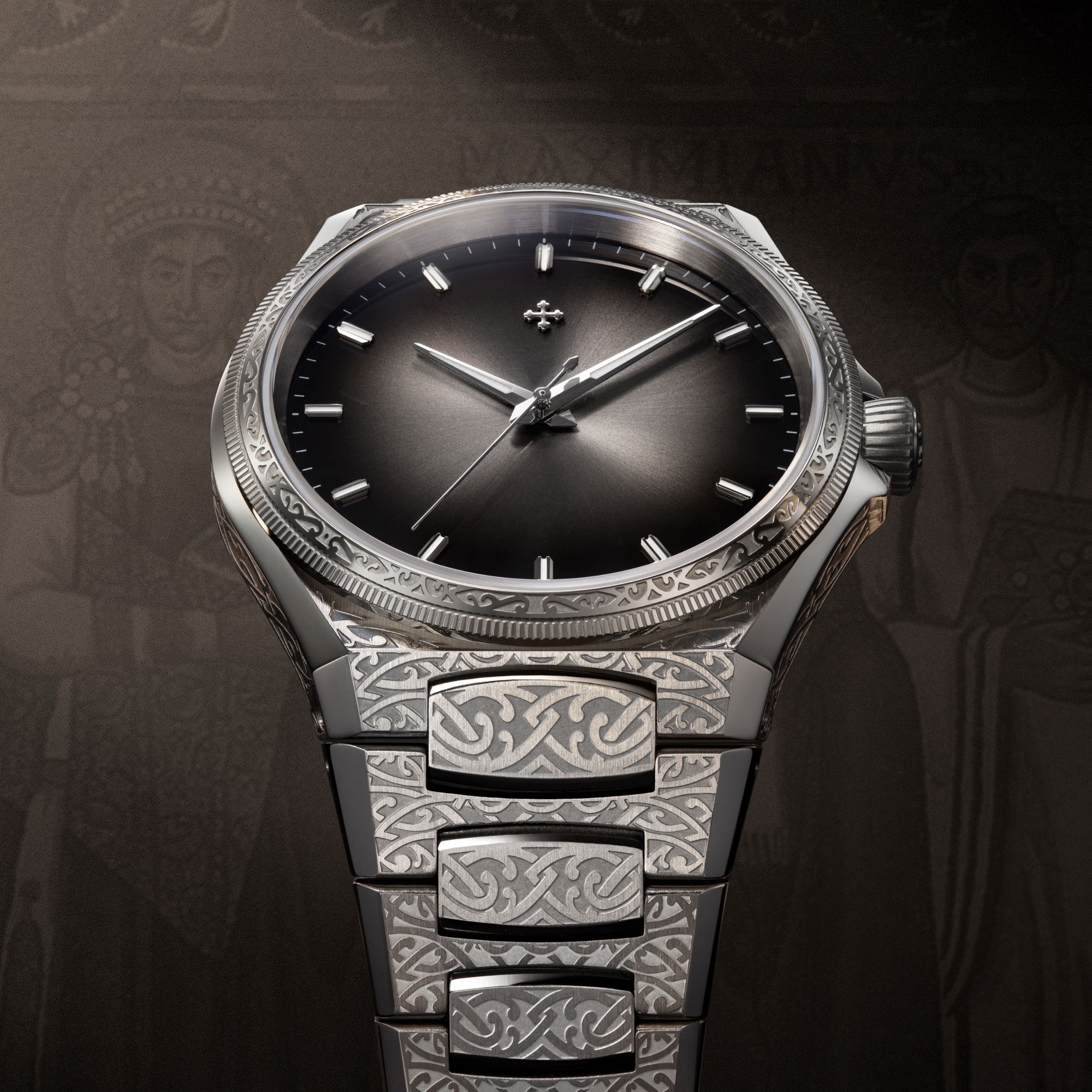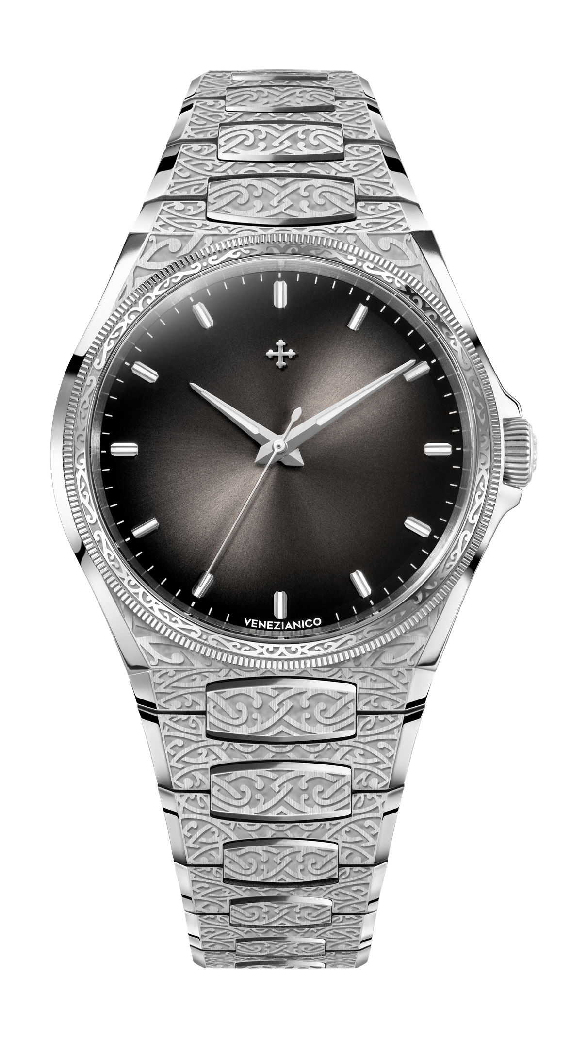 Venezianico’s Arsenale Bizantino channels the meeting point between Constantinople’s ornate visual tradition and Venice’s disciplined aesthetic, delivering a 40 mm steel watch whose engraved surfaces echo Byzantine geometry with contemporary restraint. The motif flows across case, bezel and bracelet, its reliefs sculpted in satin-finished 316L steel, contrasted by a smoked anthracite soleil dial with a fumé gradient that catches and bends the light. At under 10 mm thick and powered by the Miyota 9039, it balances mechanical finesse with a striking architectural presence.