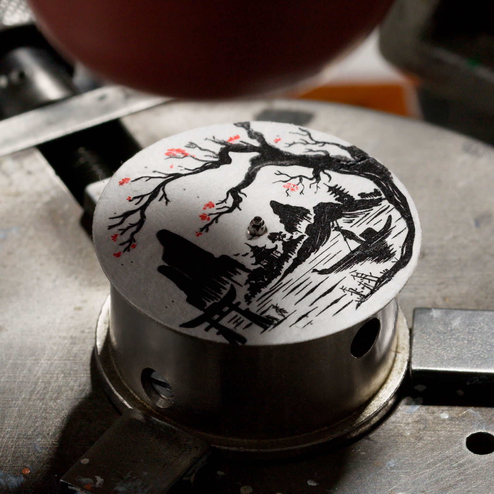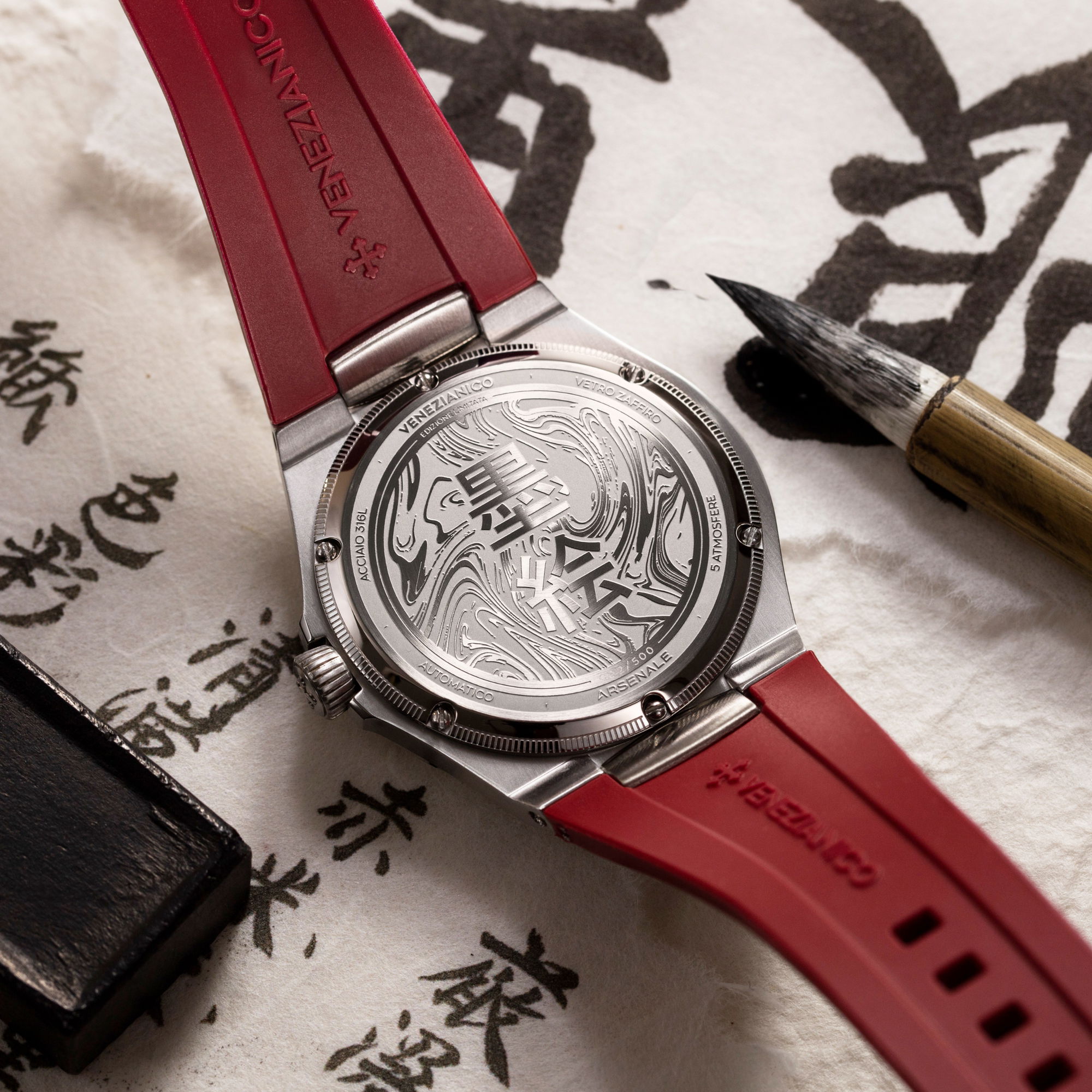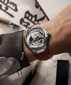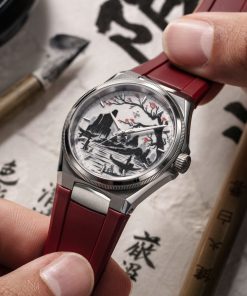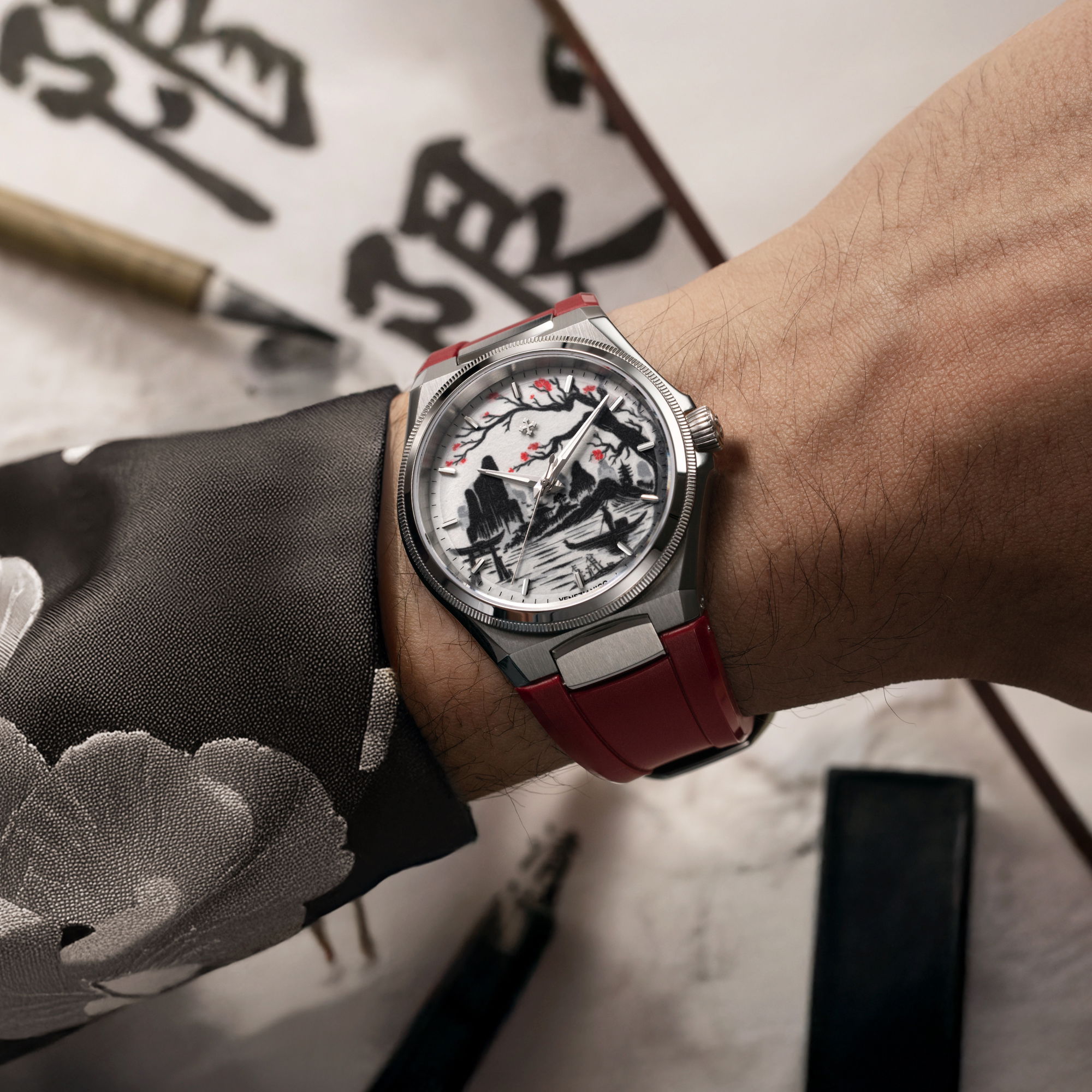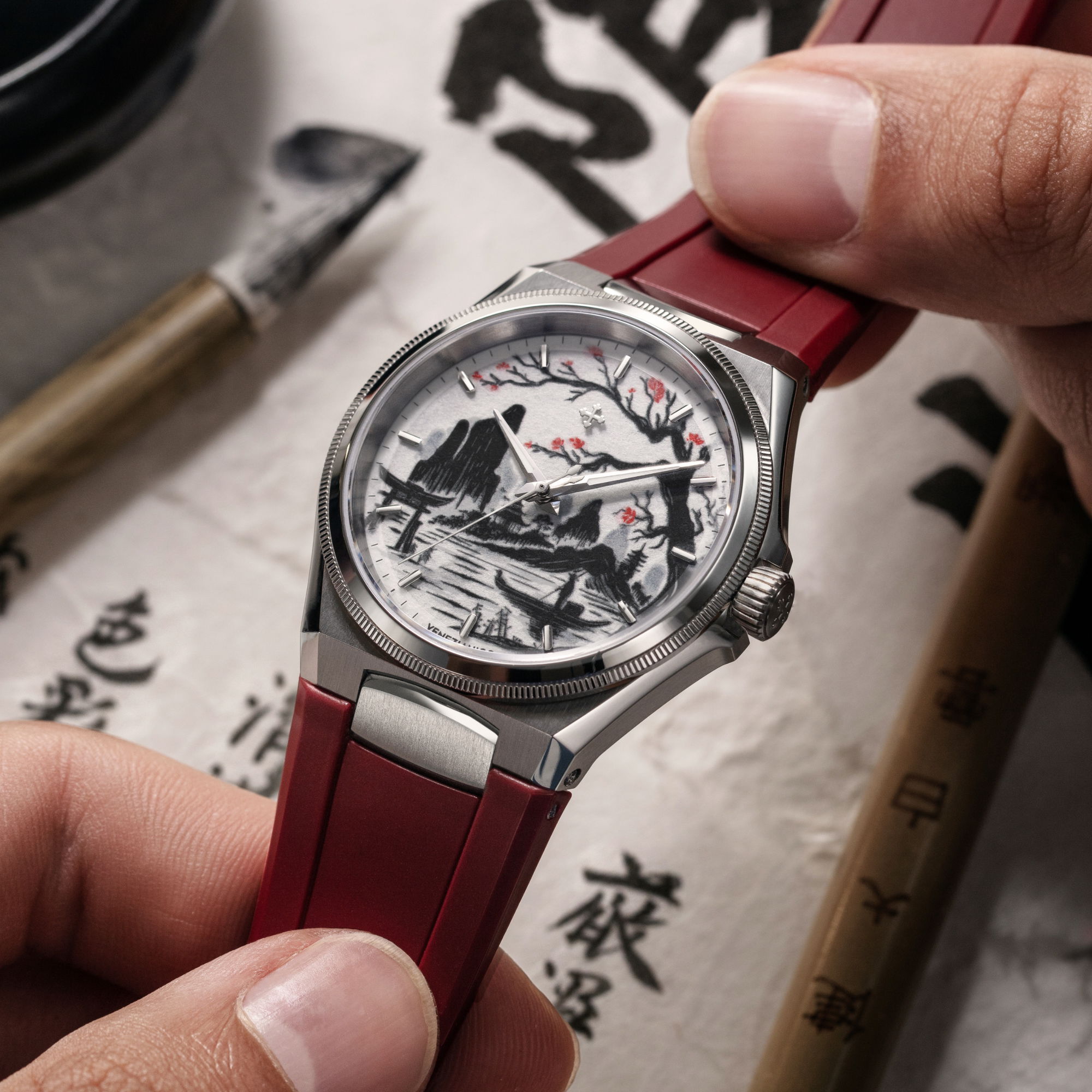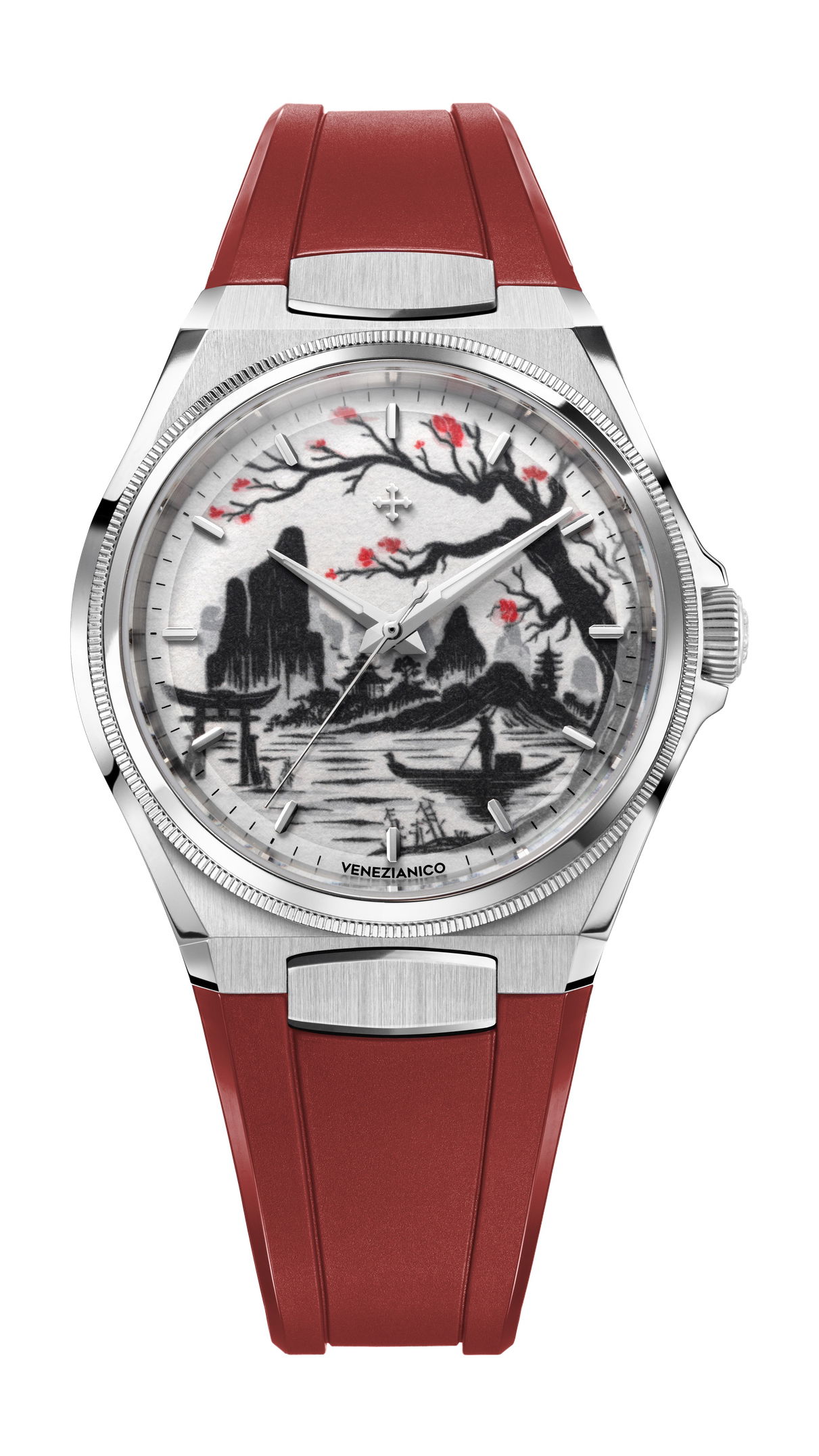 Echoing the age-old spirit of Venetian merchants who sailed east in search of beauty and knowledge, the Morelli brothers continue that legacy in steel. The 40mm satin-finished case, just 9.95mm thick, frames this scene with minimalist restraint. Its interplay of polished and brushed surfaces mirrors the contrasts of ink and emptiness, of presence and silence. A deep red rubber strap adds warmth, a pulse of Venetian passion meeting Japanese serenity.