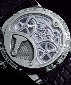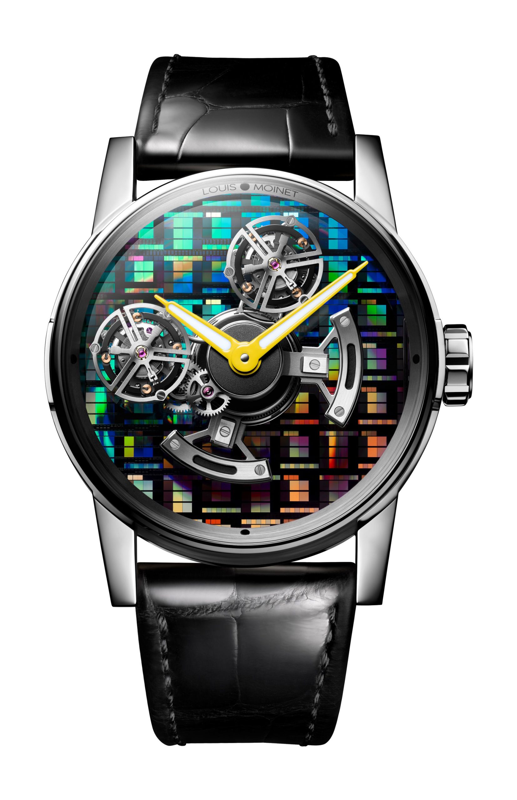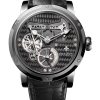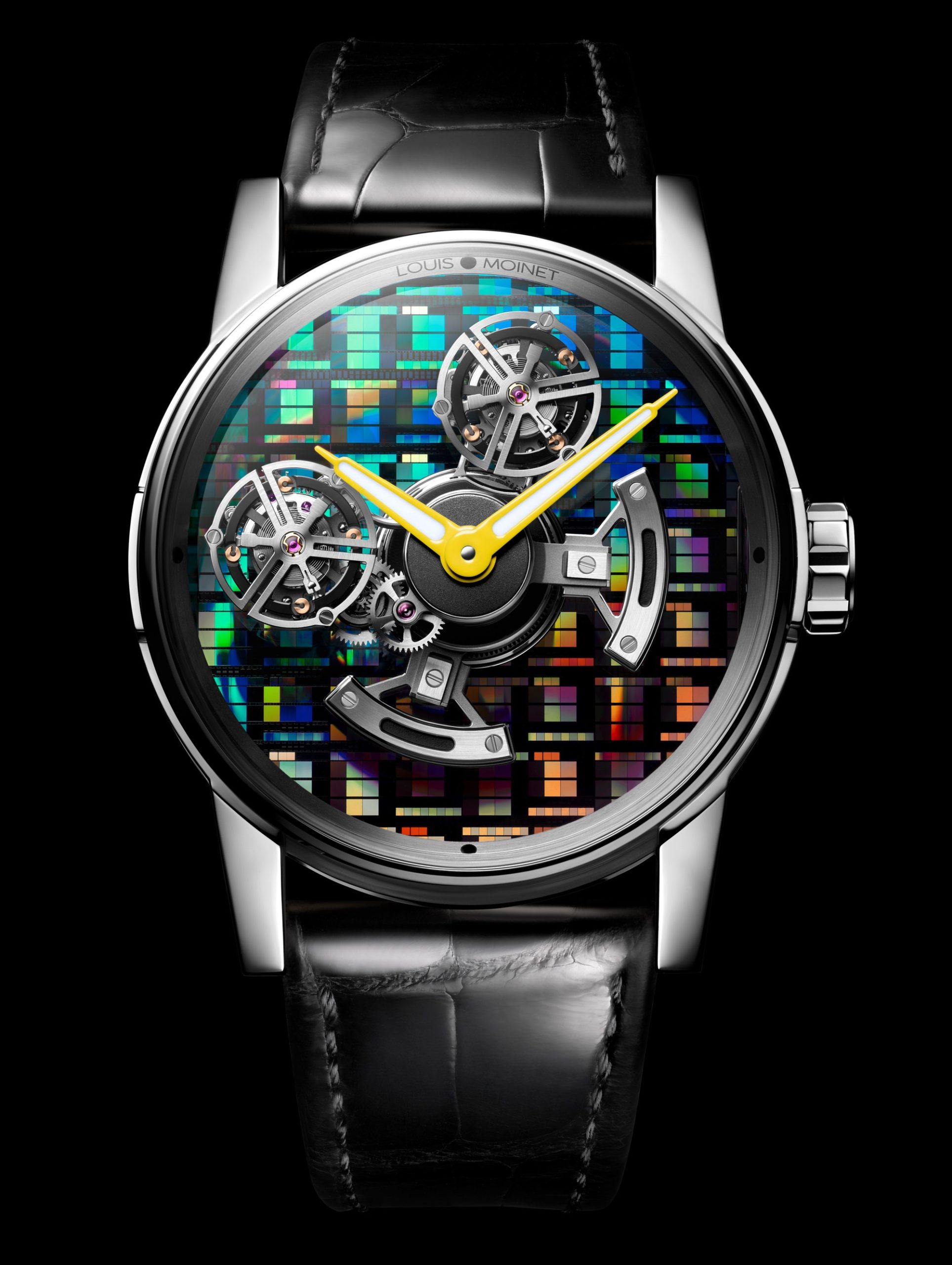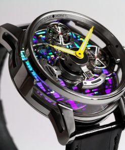 The Louis Moinet ASTRONEF TECHNO is a watchmaking innovation that combines state-of-the-art mechanics with high-end materials to create a unique masterpiece. The watch features a double satellite tourbillon, with each tourbillon in its own rotating cage at different speeds, aligning perfectly every three minutes and twenty seconds for precision. The tourbillons are exceptionally lightweight and are complemented by a counterweight that enhances the watch’s precision through a central differential.