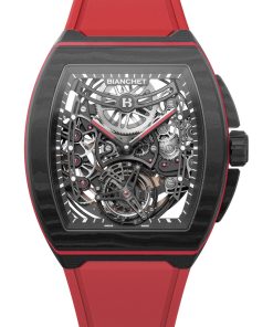Bianchet’s obsession with harmony is evident in every detail. Inspired by the Golden Ratio, the UltraFino’s proportions flow seamlessly from its curved tonneau case to its integrated carbon bracelet. A palette of color accents—sky blue, red, or white—complements the brand’s signature rubber gasket, while polished chamfers and smoothed edges add a sleek, aerodynamic profile. Despite its avant-garde materials and ultralight build, the UltraFino is water resistant to 5 ATM and engineered to withstand shocks of up to 5000G, making it as comfortable on the wrist as it is capable in motion.