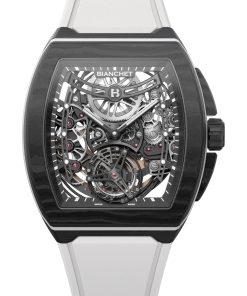Bianchet’s obsession with harmony is evident in every detail. Inspired by the Golden Ratio, the UltraFino’s proportions flow seamlessly from its curved tonneau case to its integrated carbon bracelet. A palette of color accents—sky blue, red, or white—complements the brand’s signature rubber gasket, while polished chamfers and smoothed edges add a sleek, aerodynamic profile. Despite its avant-garde materials and ultralight build, the UltraFino is water resistant to 5 ATM and engineered to withstand shocks of up to 5000G, making it as comfortable on the wrist as it is capable in motion.