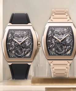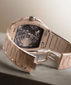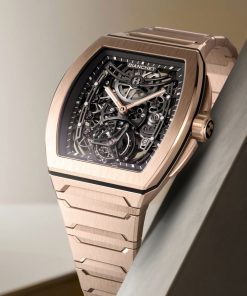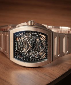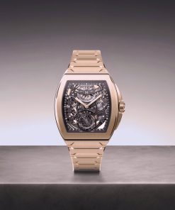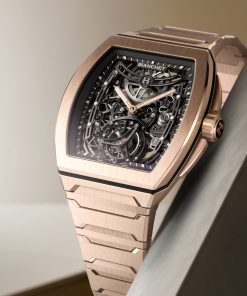At WatchTime New York, Bianchet introduced the UltraFino Gold Edition, a warm, golden take on its ultra-thin tourbillon. The case is in 18K rose gold, its curves and edges echoing the architectural geometry that’s become a Bianchet signature. Inside beats the automatic Calibre UT01, a movement that’s just 3.85 mm thick, built from titanium, and finished in deep black PVD for contrast and drama.